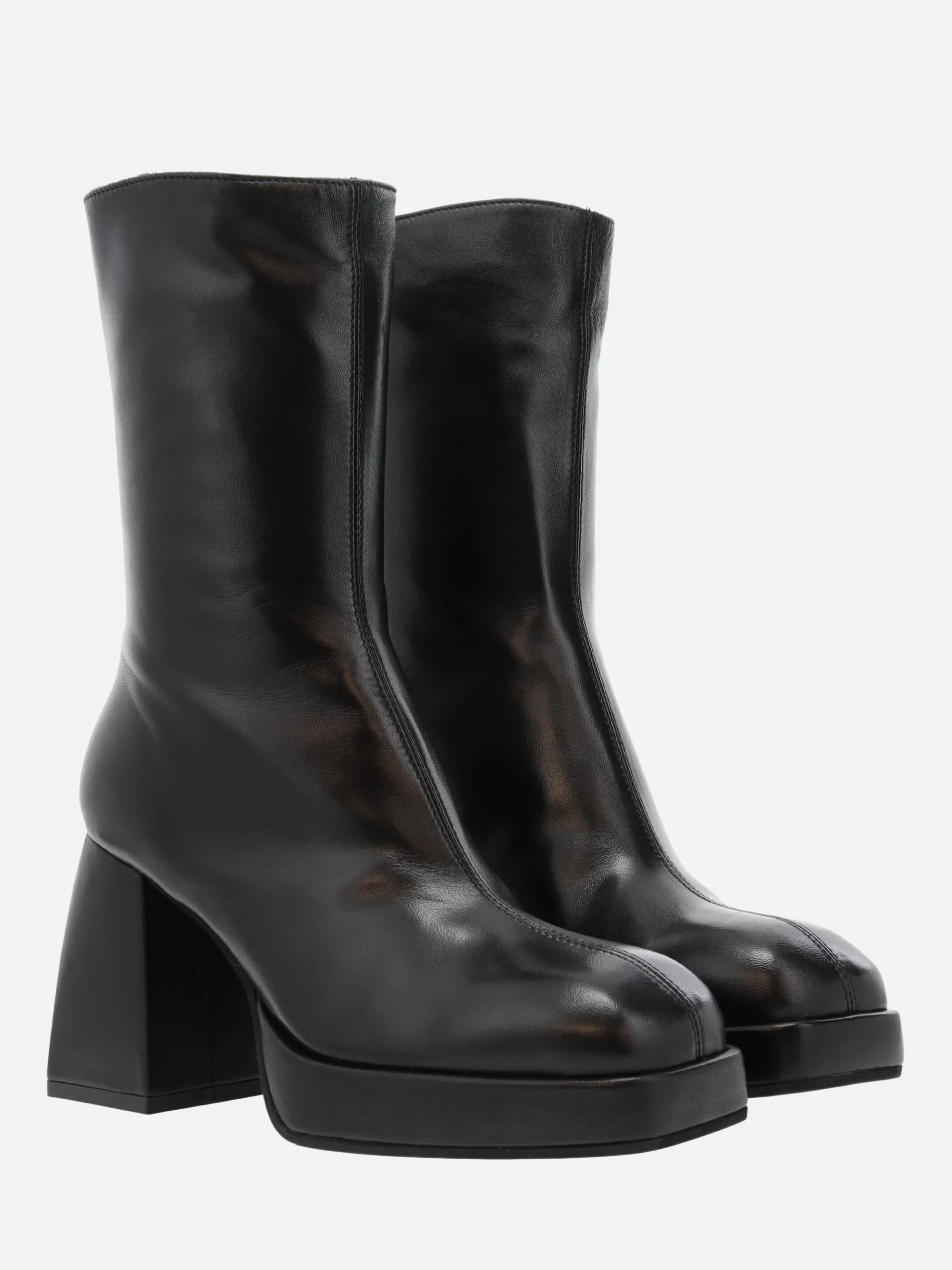 Open Closed Plata 02 is a minimalist knee-high leather boot sitting on a tall block heel.