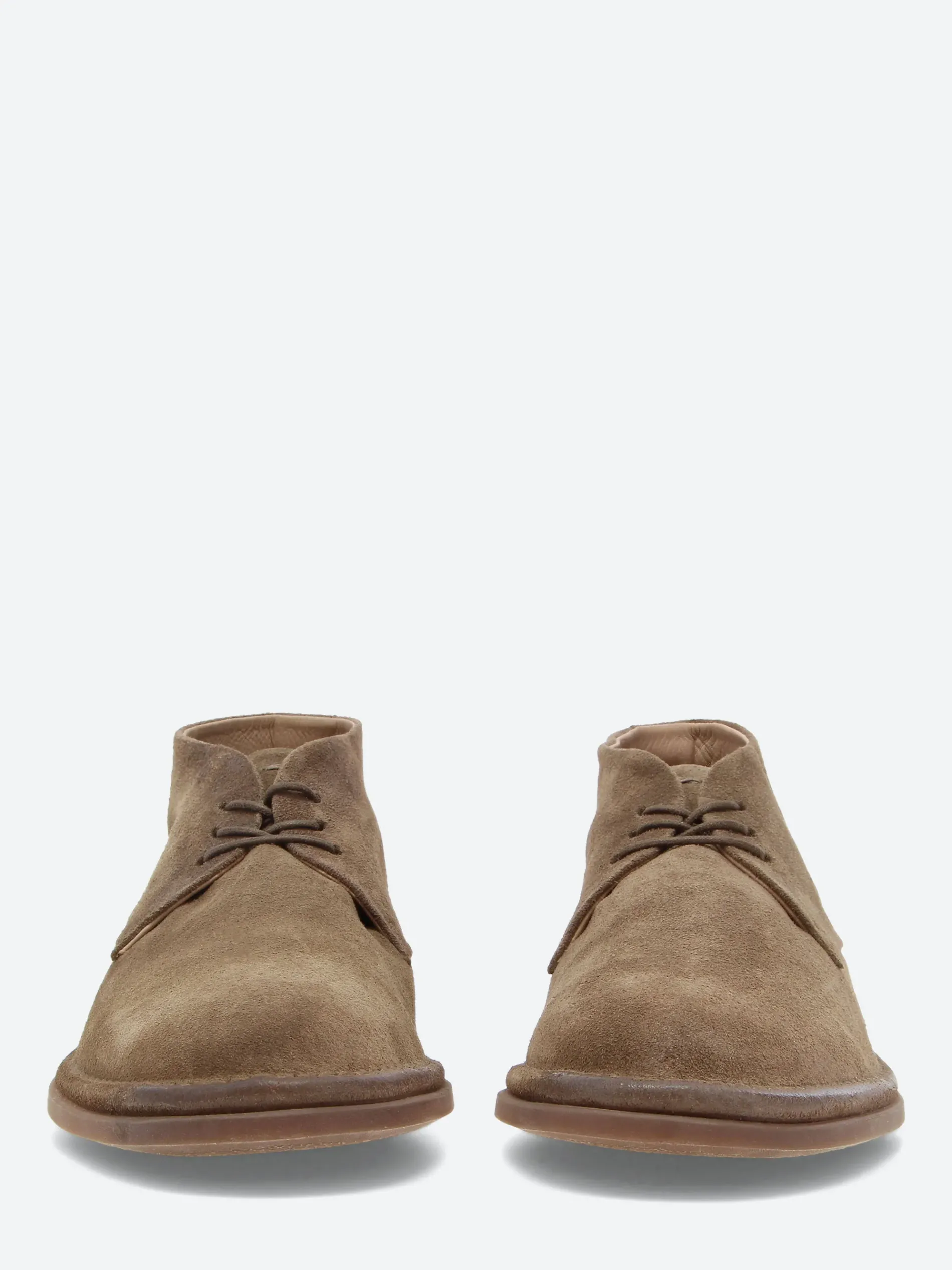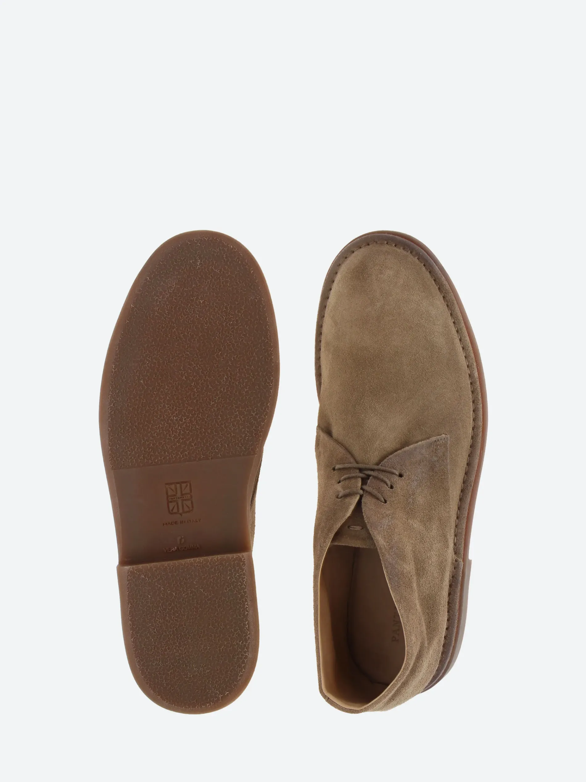 These Pantanetti chukka boots are handmade in Italy, offering a sleek and versatile design. The suede upper, paired with subtle stitching and a lace-up closure, ensures a comfortable and secure fit. The durable rubber sole provides flexibility and support, making these boots a stylish and practical choice for any occasion.