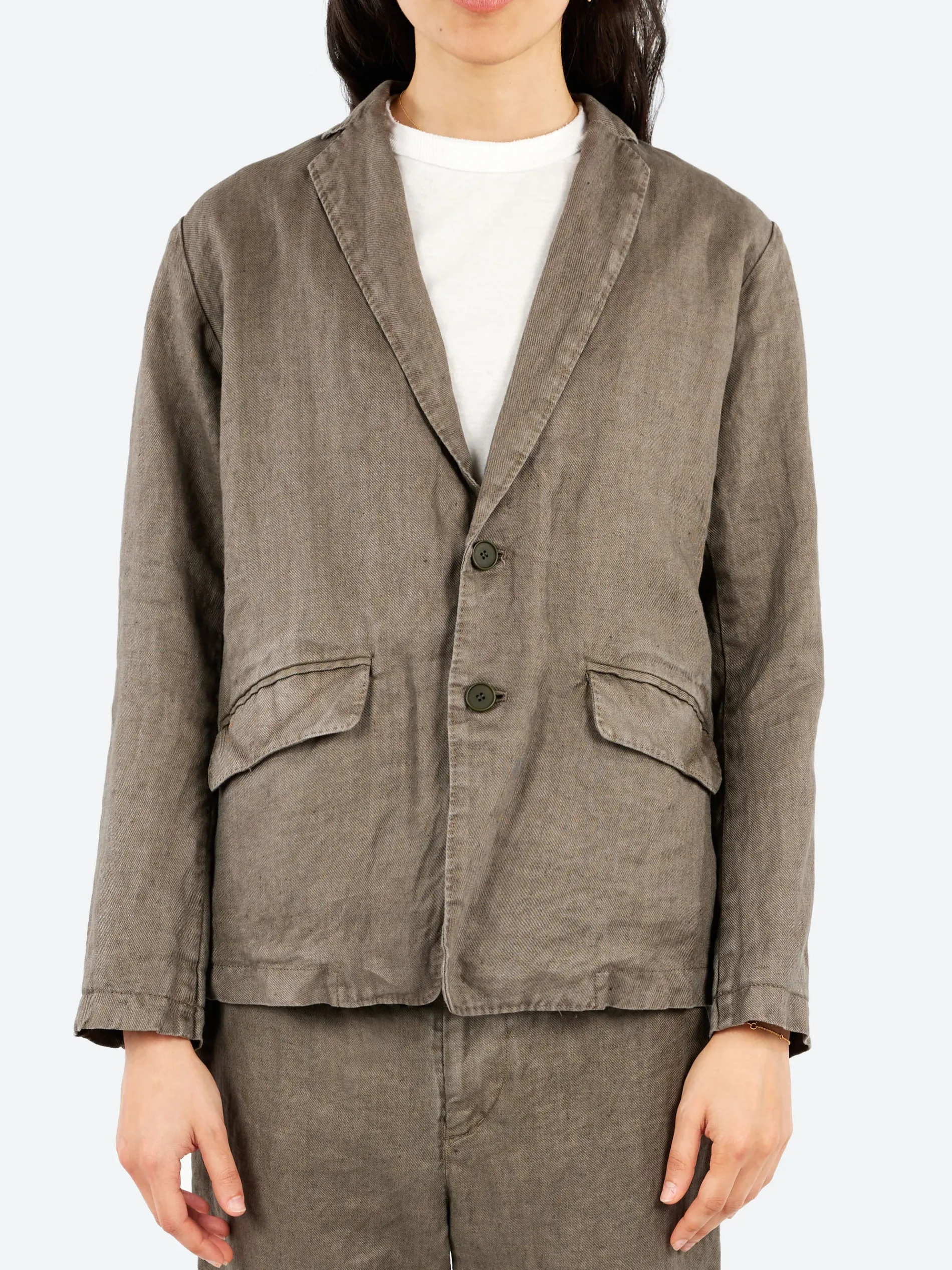 This jacket is crafted from linen twill and garment dyed for a worn-in finish. It features a notched collar, a two-button closure, and flap pockets for a functional yet stylish look. Lined in cotton for added comfort, the jacket boasts a relaxed silhouette, making it a versatile and timeless addition to any wardrobe.