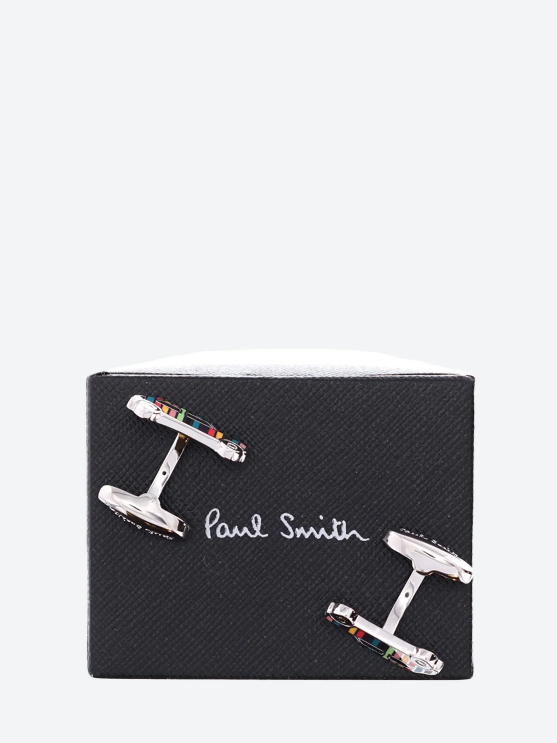 Paul Smith mini car cufflinks featuring a polished silver finish and signature embossed T-bar fastenings.