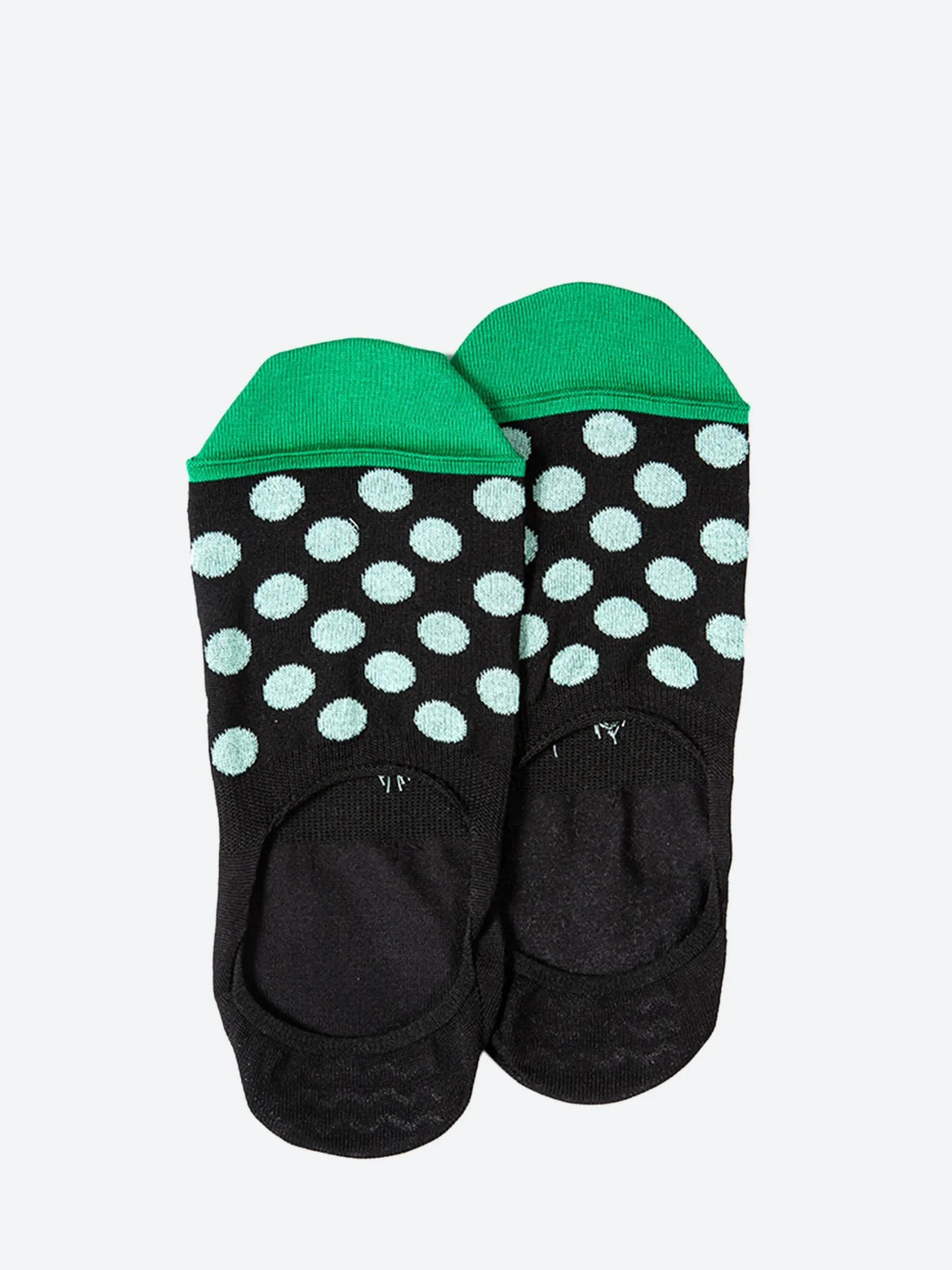 Men’s black no show socks featuring a bright spot pattern and internal rubber heel grips.