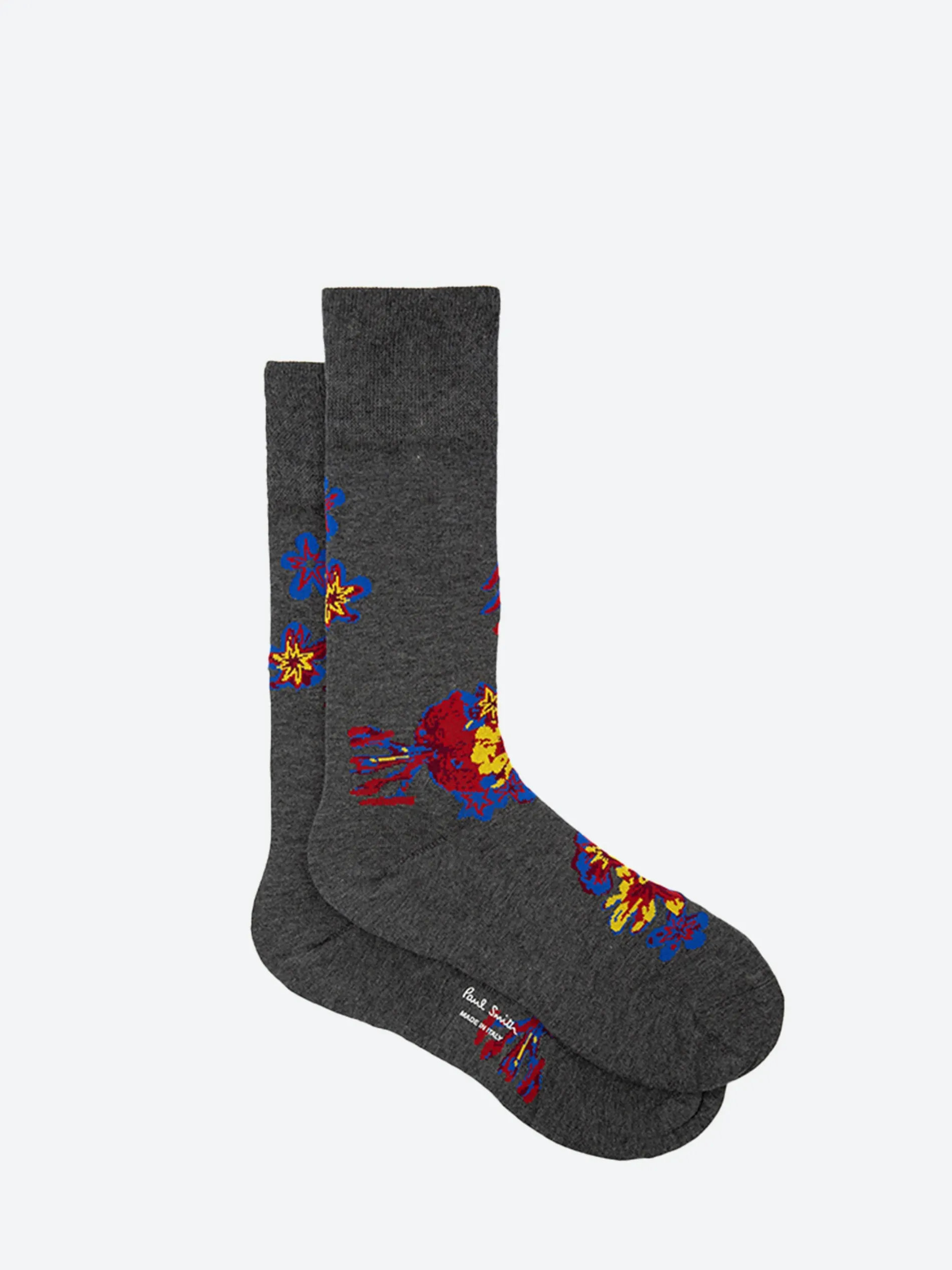 Paul Smith ankle length socks feature a lilac, red and blue ‘Winter Hawaiian’ pattern throughout with ribbed trims.