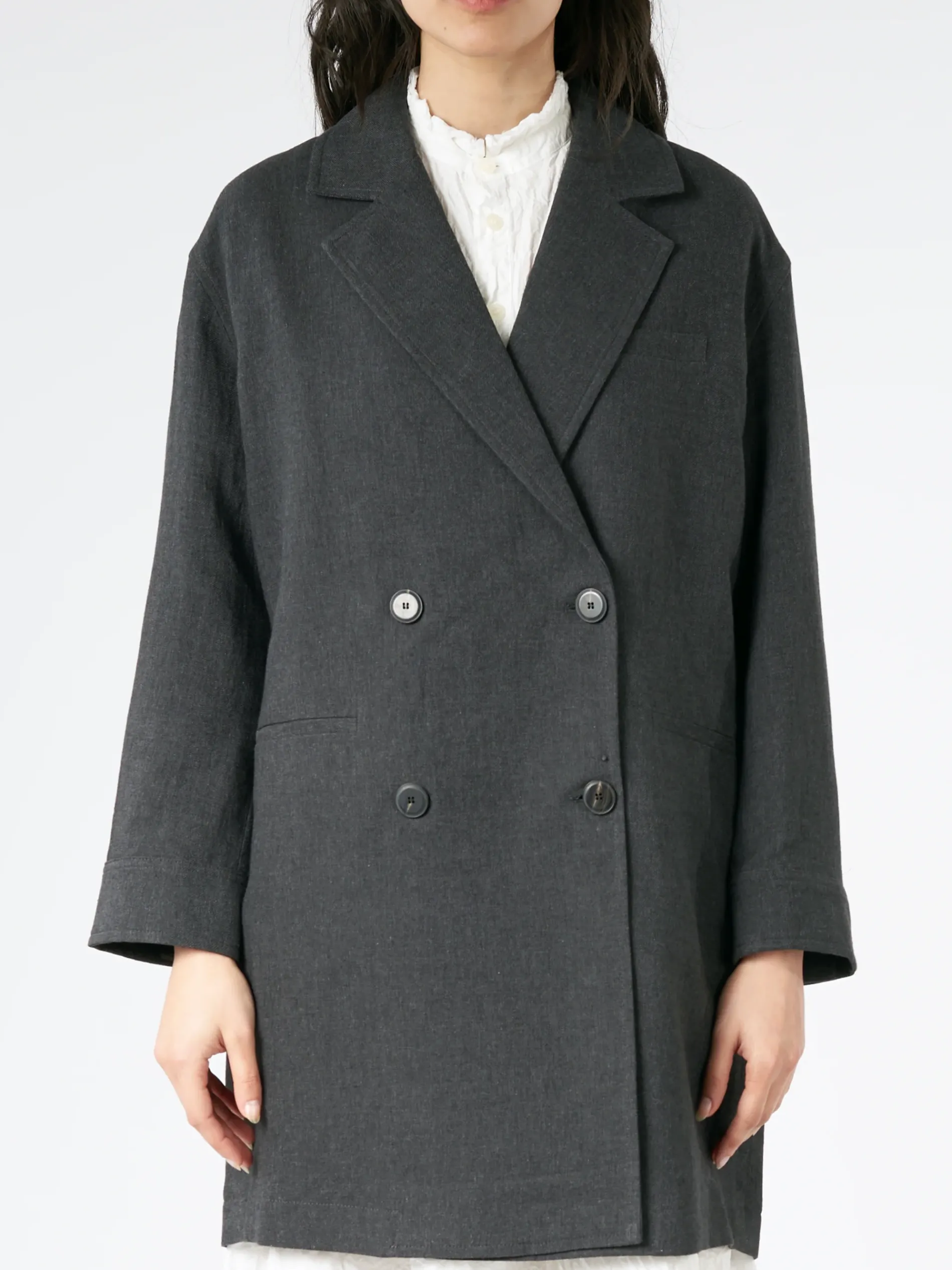 Constructed from a luxurious blend of cotton and yarn-dyed linen, this coat boasts a double-breasted button closure, dropped shoulders, and welt pockets for functional elegance. A back vent to keep you comfortable.