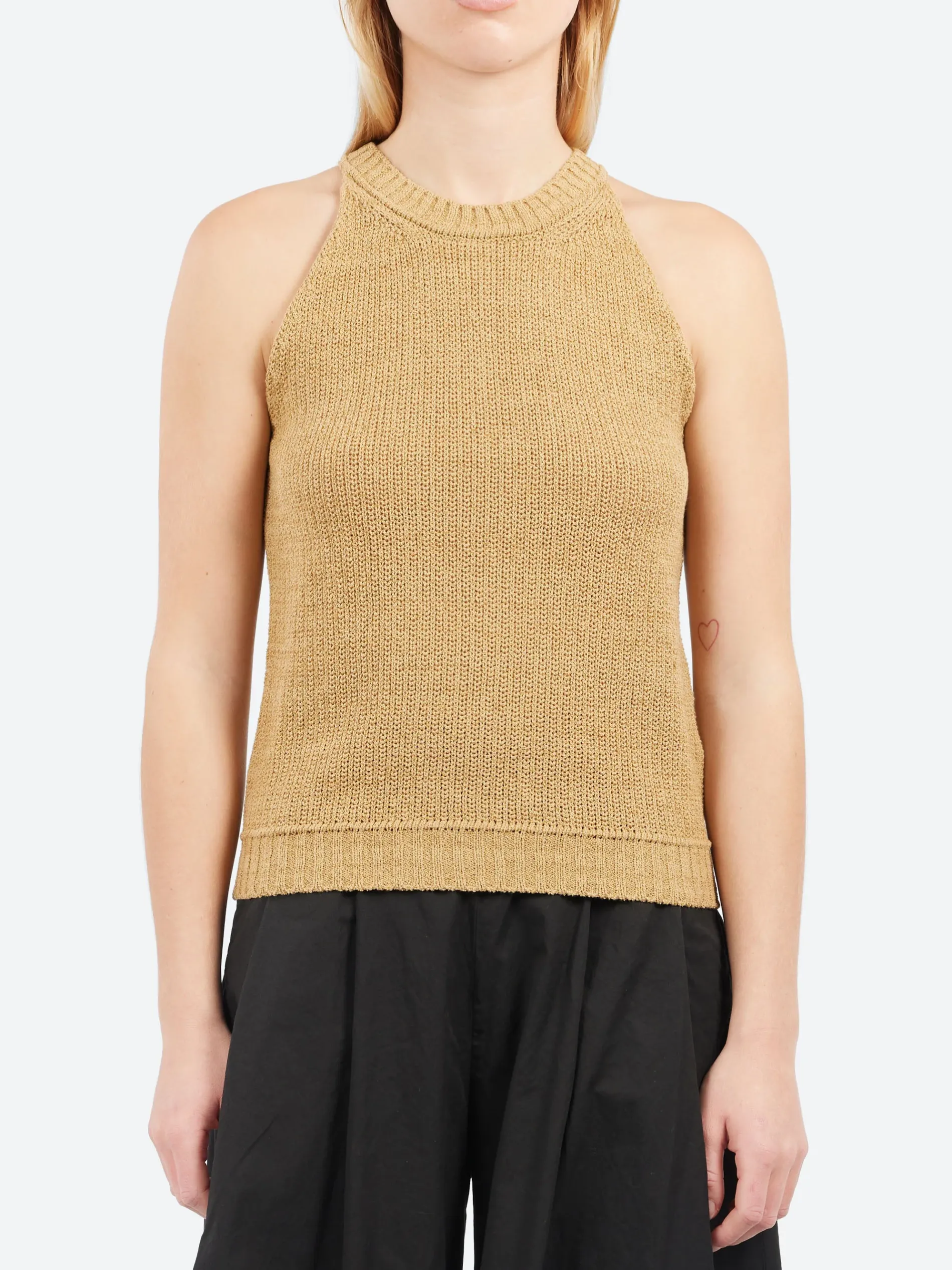 Traditional craftsmanship and feminine details enhance the summer charm of the cotton and linen knit tank top. The contrasting technique on the neckline and hem, as well as the deep opening, enrich the garment with a clean and essential character, while giving the model a light and airy appearance. Both fresh and comfortable, the cotton and linen yarn is ideal for the summer months.