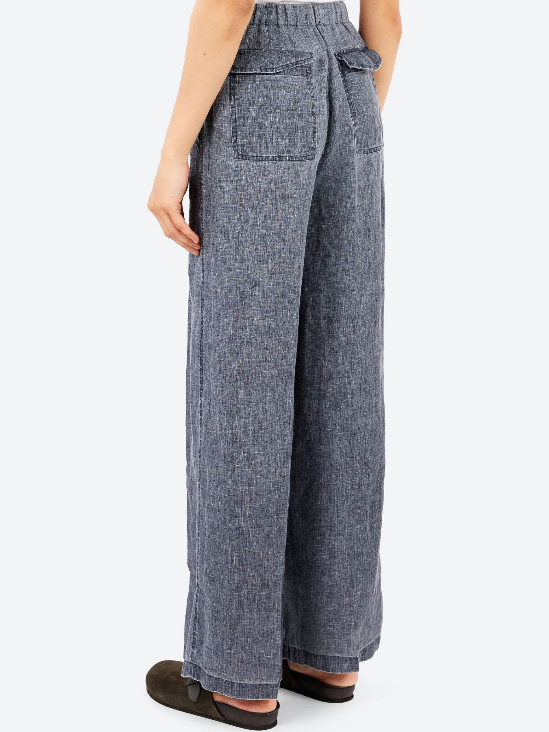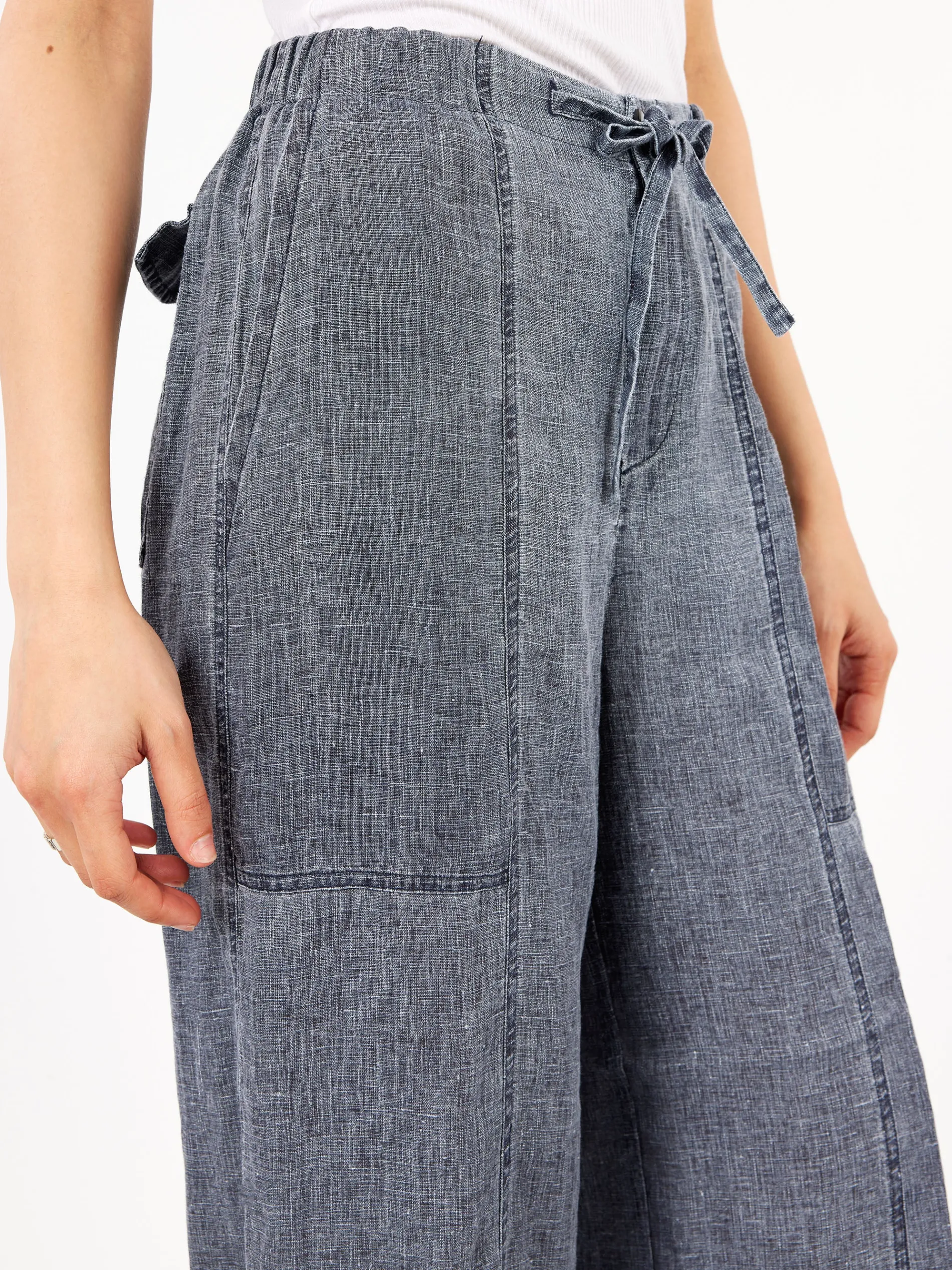 The 100% linen fabric provides a light, fresh feel, paired with an elastic waistband and drawstring for a sporty touch. The relaxed fit flows comfortably along the leg for a modern look, while large patch pockets at the back add casual appeal. The unique dyeing process creates subtle variations in color, with shades around the seams and edges, enhancing the garment’s distinctive charm.