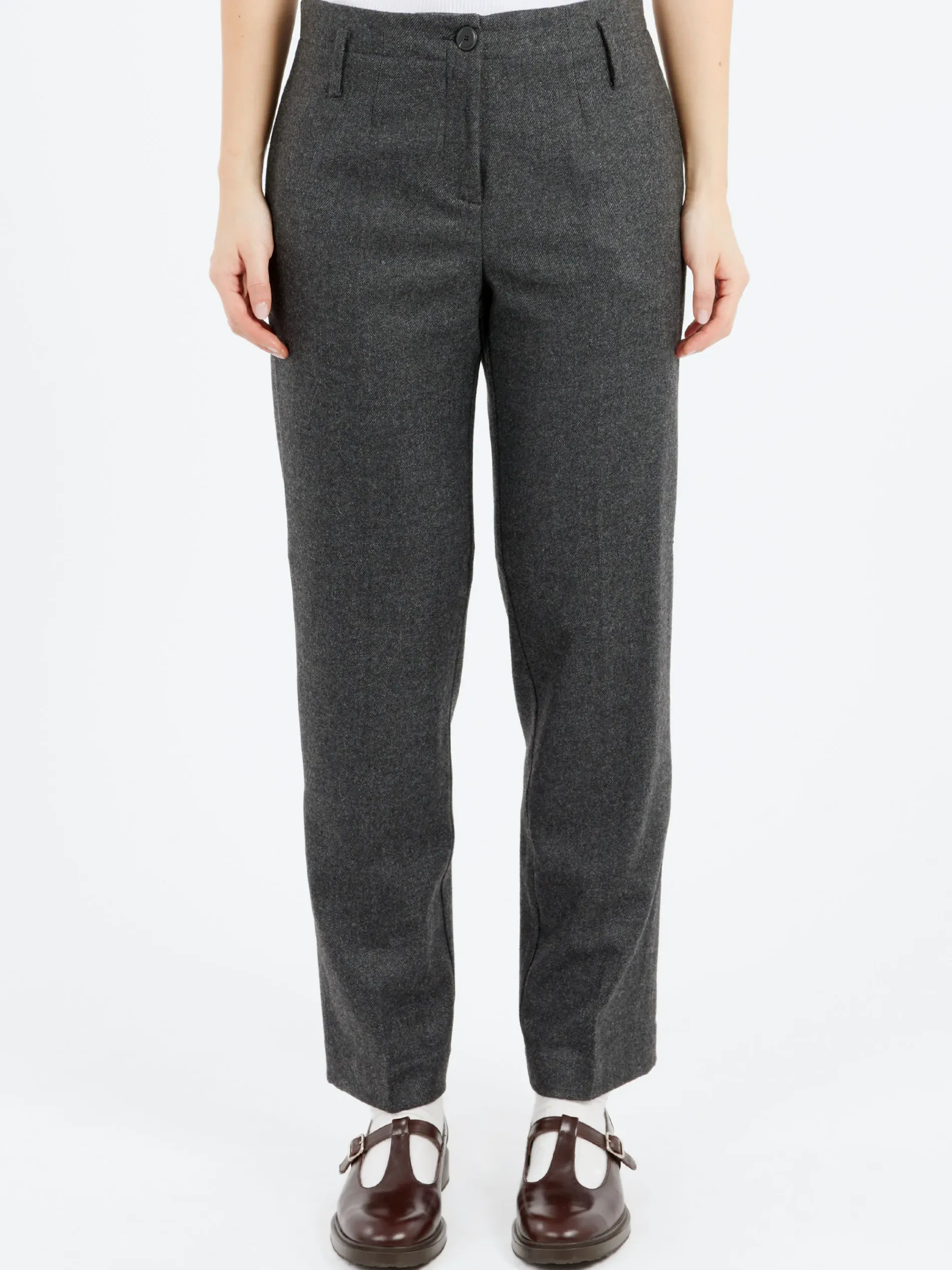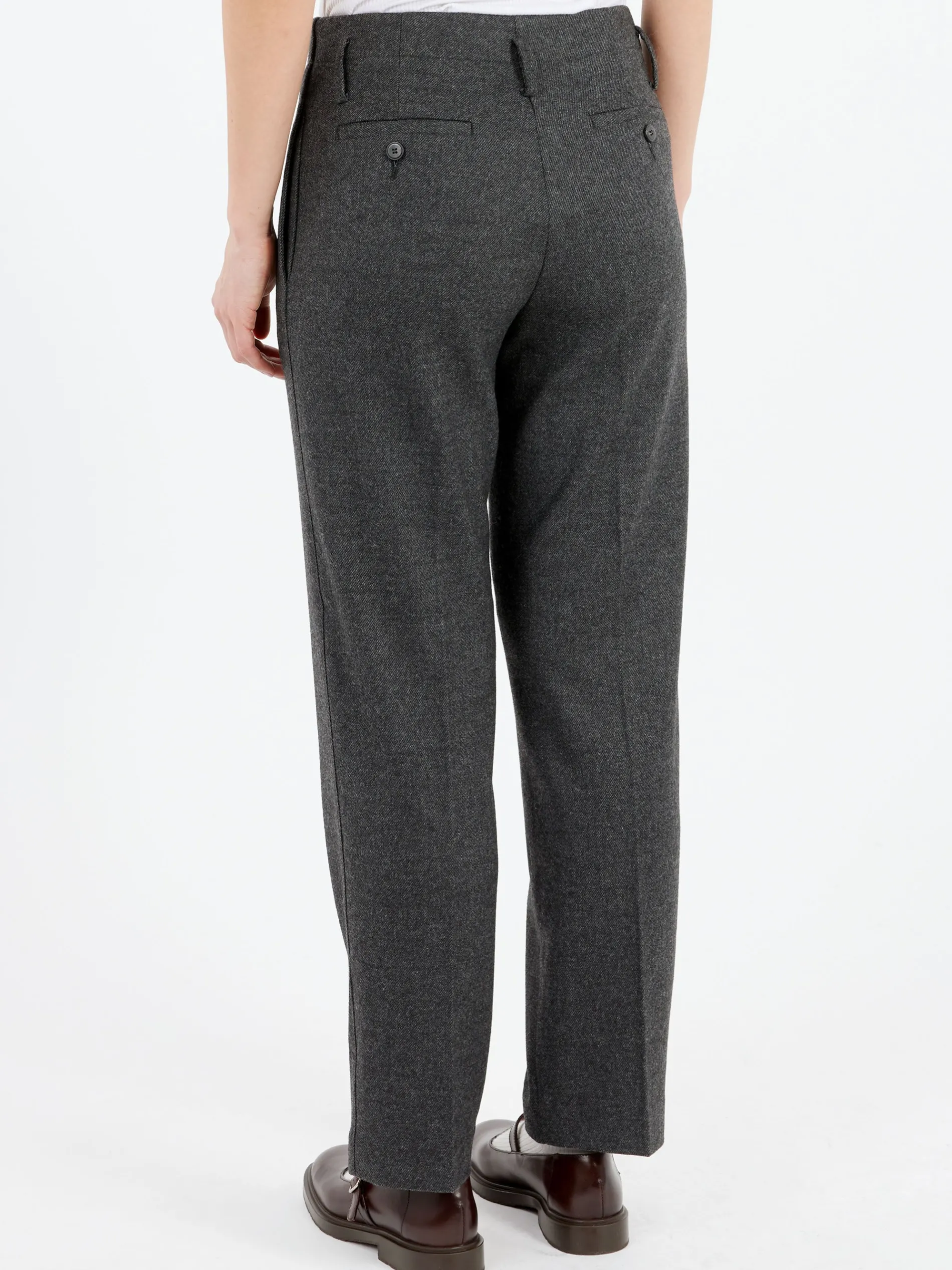 The fluid and warm texture of the wool-blend flannel, which spreads the season’s nuances, enhances the silhouette of these Pomandère trousers.