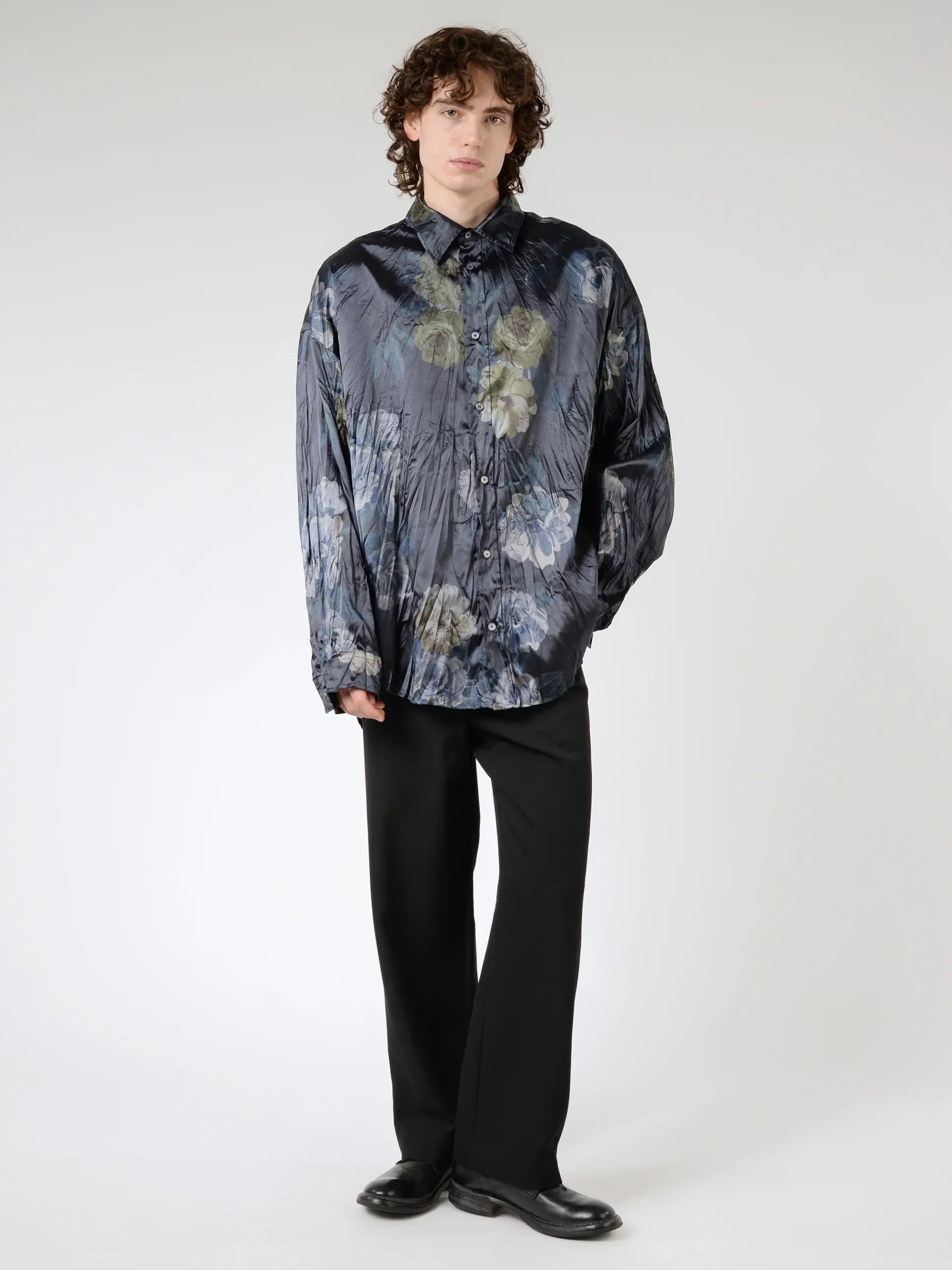 Acne Studios button-up shirt features an all-over seasonal flower print, crafted from satin fabric with a crinkled finish.