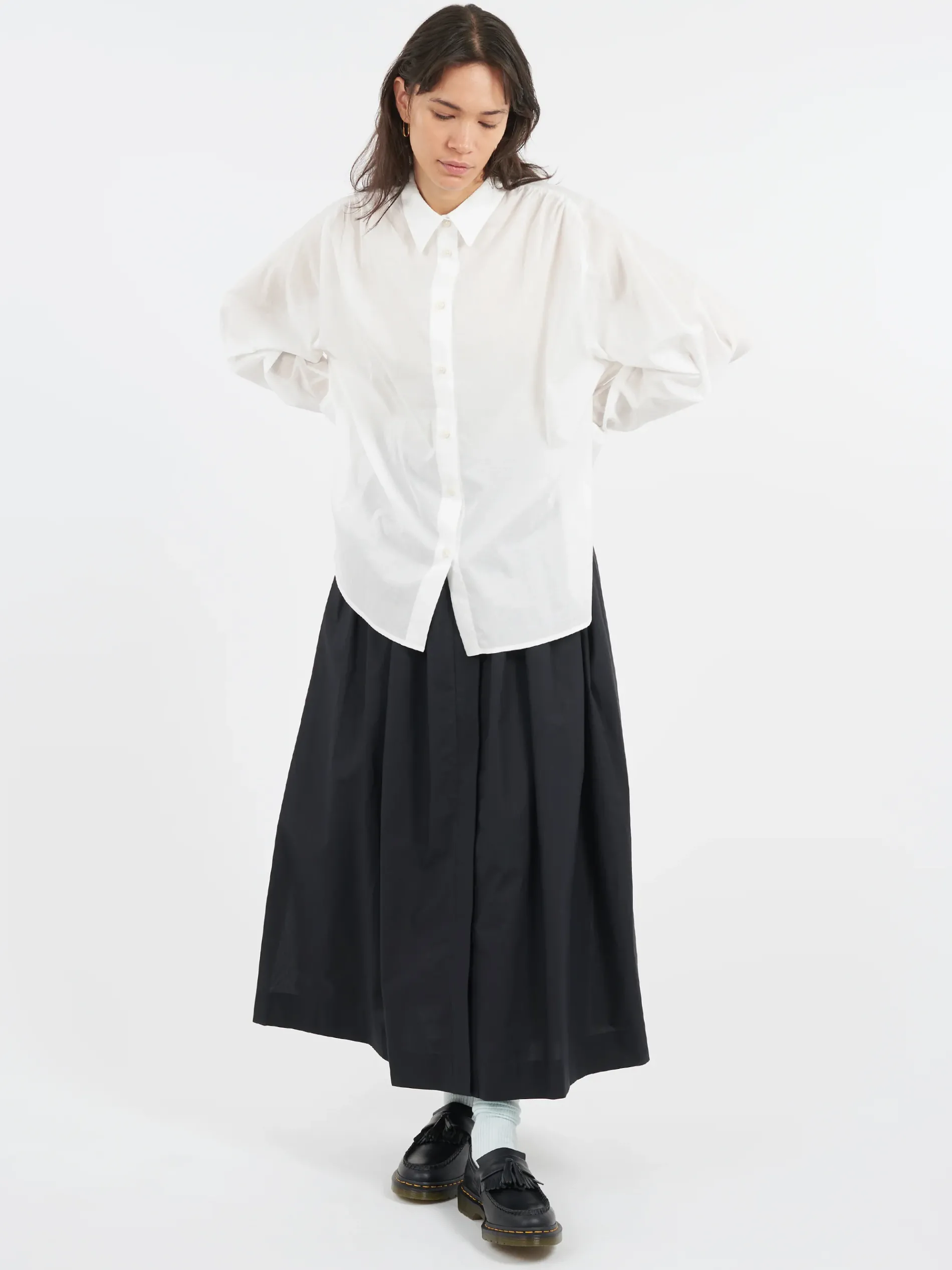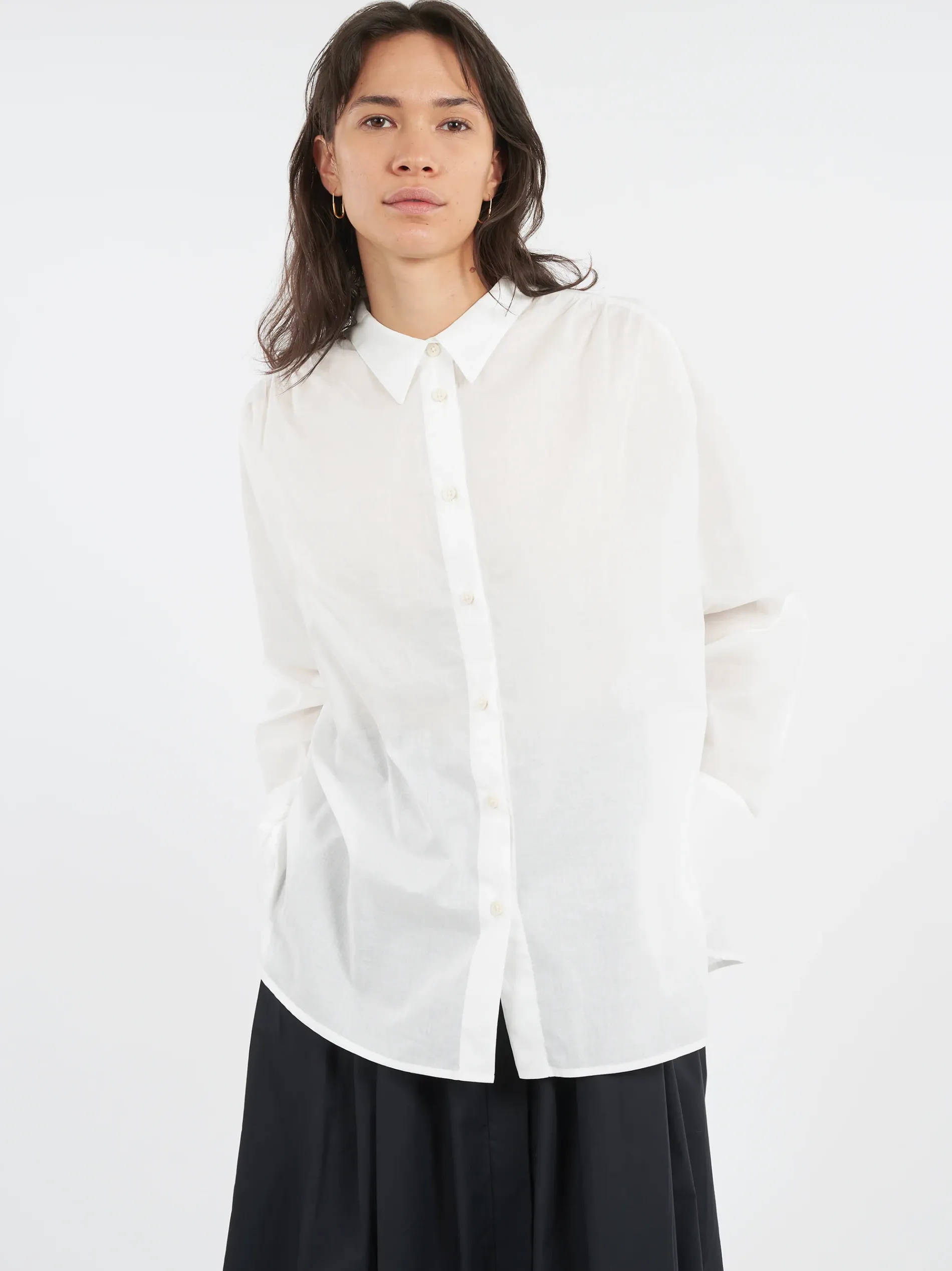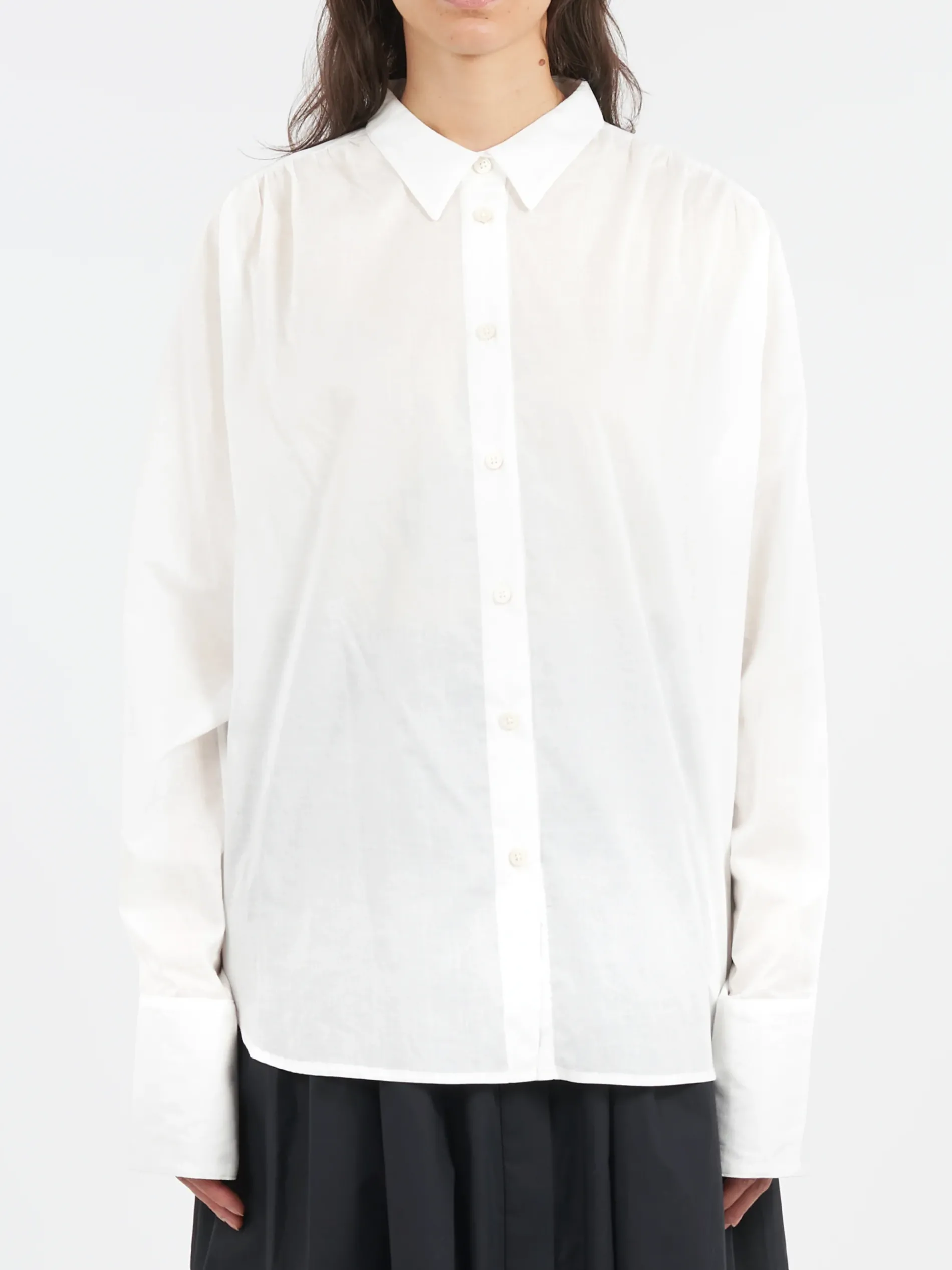 Casual button-up shirt featuring a classic collar and long sleeves with elongated buttoned cuffs, cut from soft and semi-sheer Cotton Lawn, ideal for sophisticated and lightweight summer wear.
