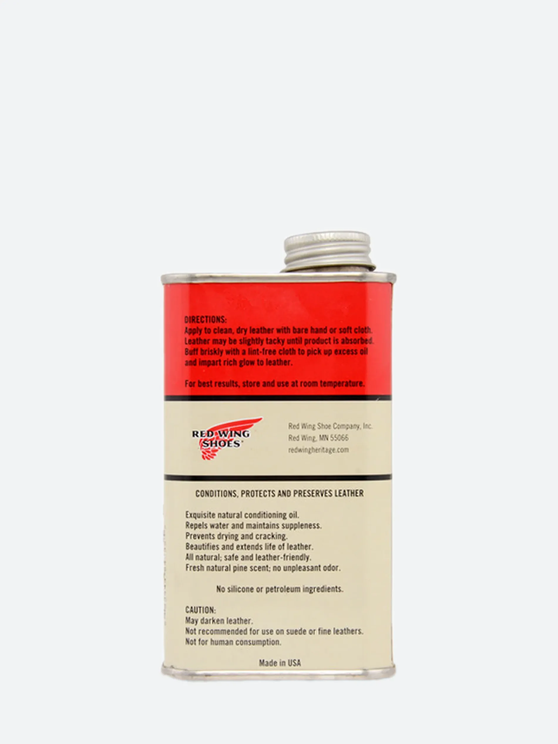 All Natural Boot Oil blends pine pitch and mink oil into a solution that conditions Red Wing oil-tanned leathers including Harness, Oil Slick, Legacy, and Oro-iginal.
