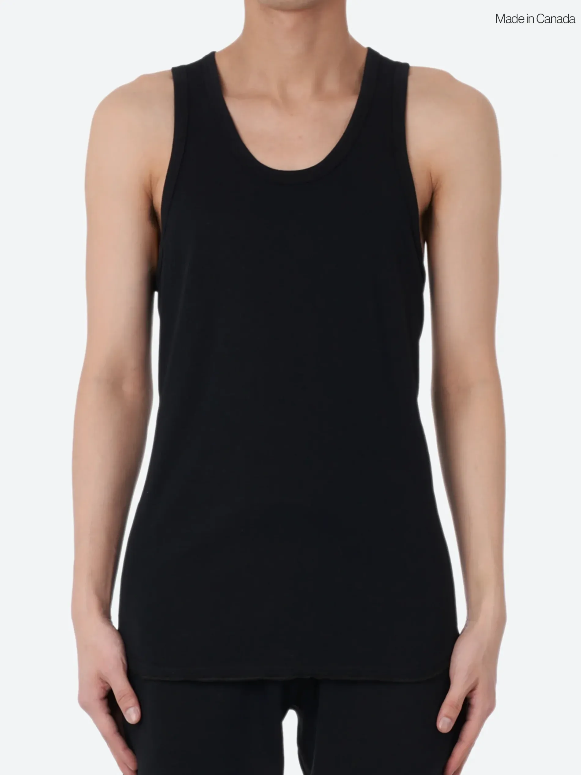 Reigning Champ premium cotton tank with low profile flatlocked seams and a scooped hem.