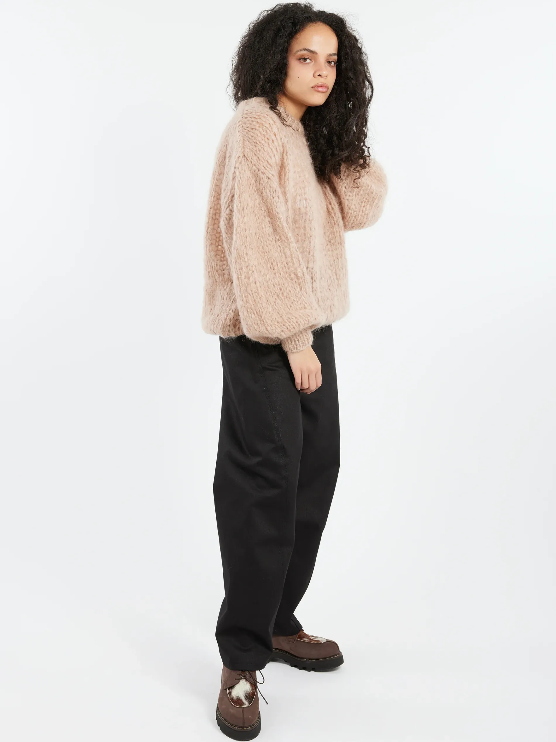 This sweater is made from a soft mohair-merino blend, providing a luxuriously textured and cozy feel.