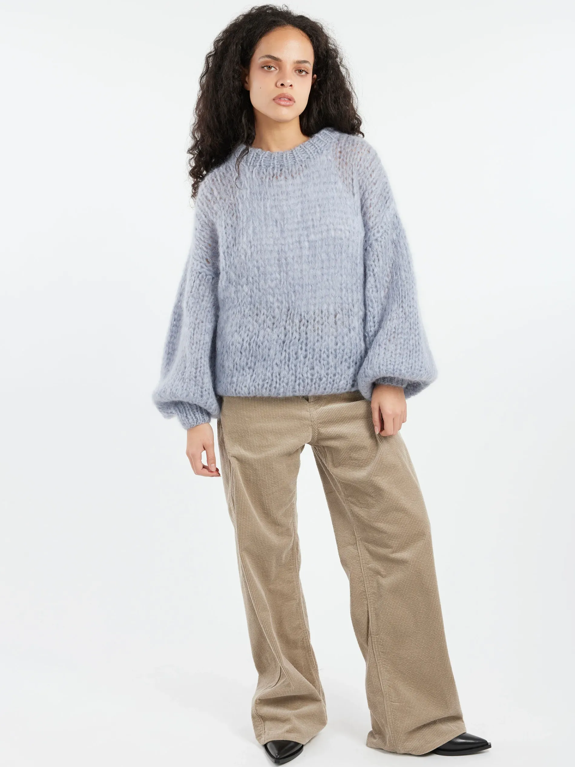 This sweater is made from a soft mohair-merino blend, providing a luxuriously textured and cozy feel.