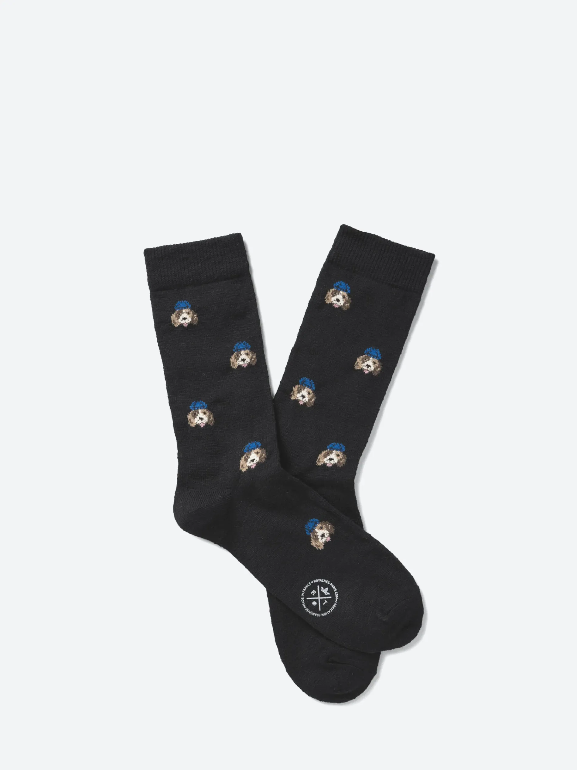 These socks are knitted with slub yarns, which gives them a workwear look. The all-over beagle jacquard pattern adds a playful touch.