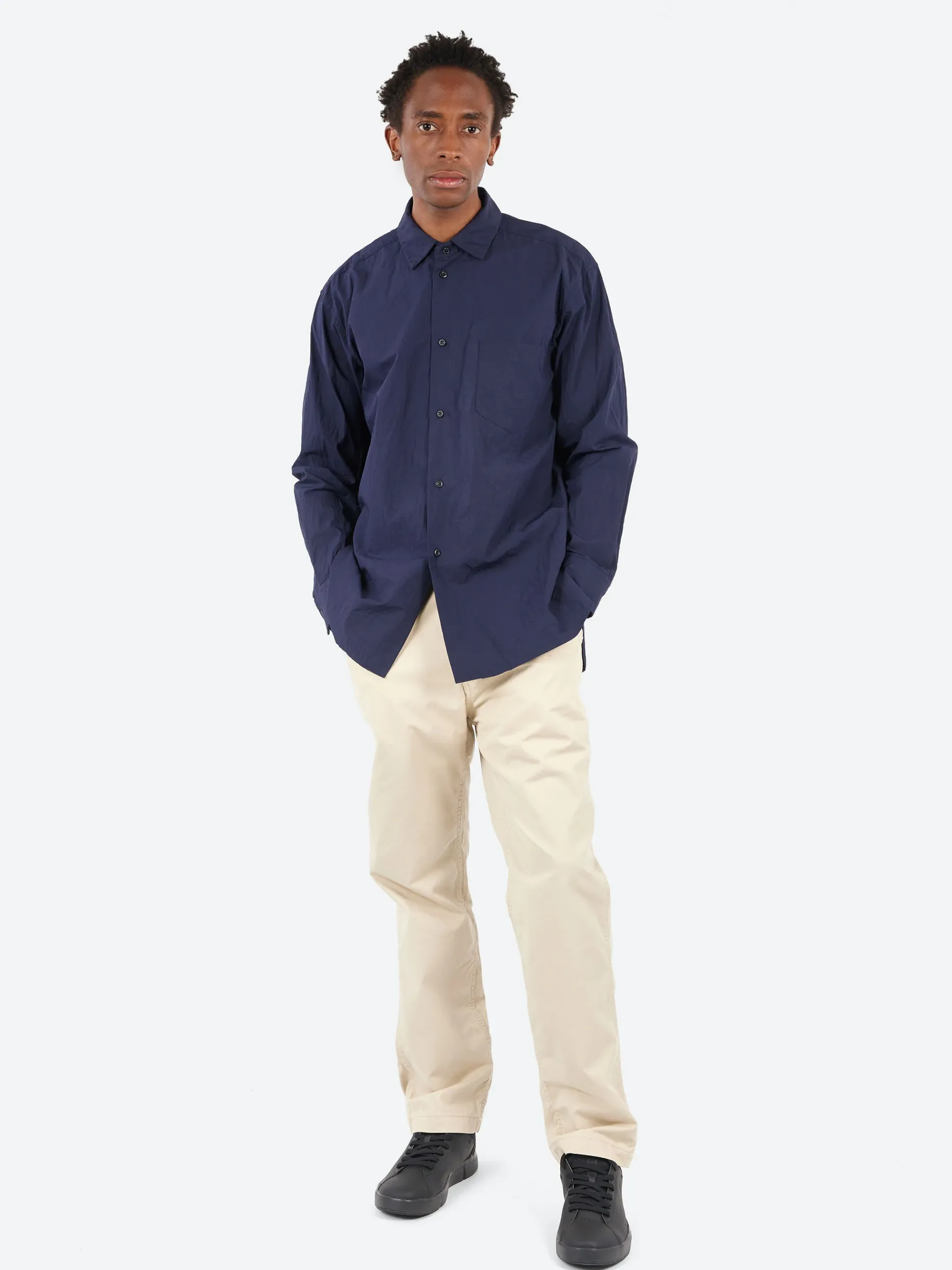 This regular collar shirt features an oversized drop shoulder design, offering a relaxed, contemporary fit. The collar and front are stitch-free, creating a soft, fluffy appearance with a lightweight finish. The outer material is made from high-density woven yarn-dyed typewriter fabric, which enhances its durability and texture. The fabric is also treated with a catch washer, adding a unique, crinkled effect for a stylish, lived-in look.