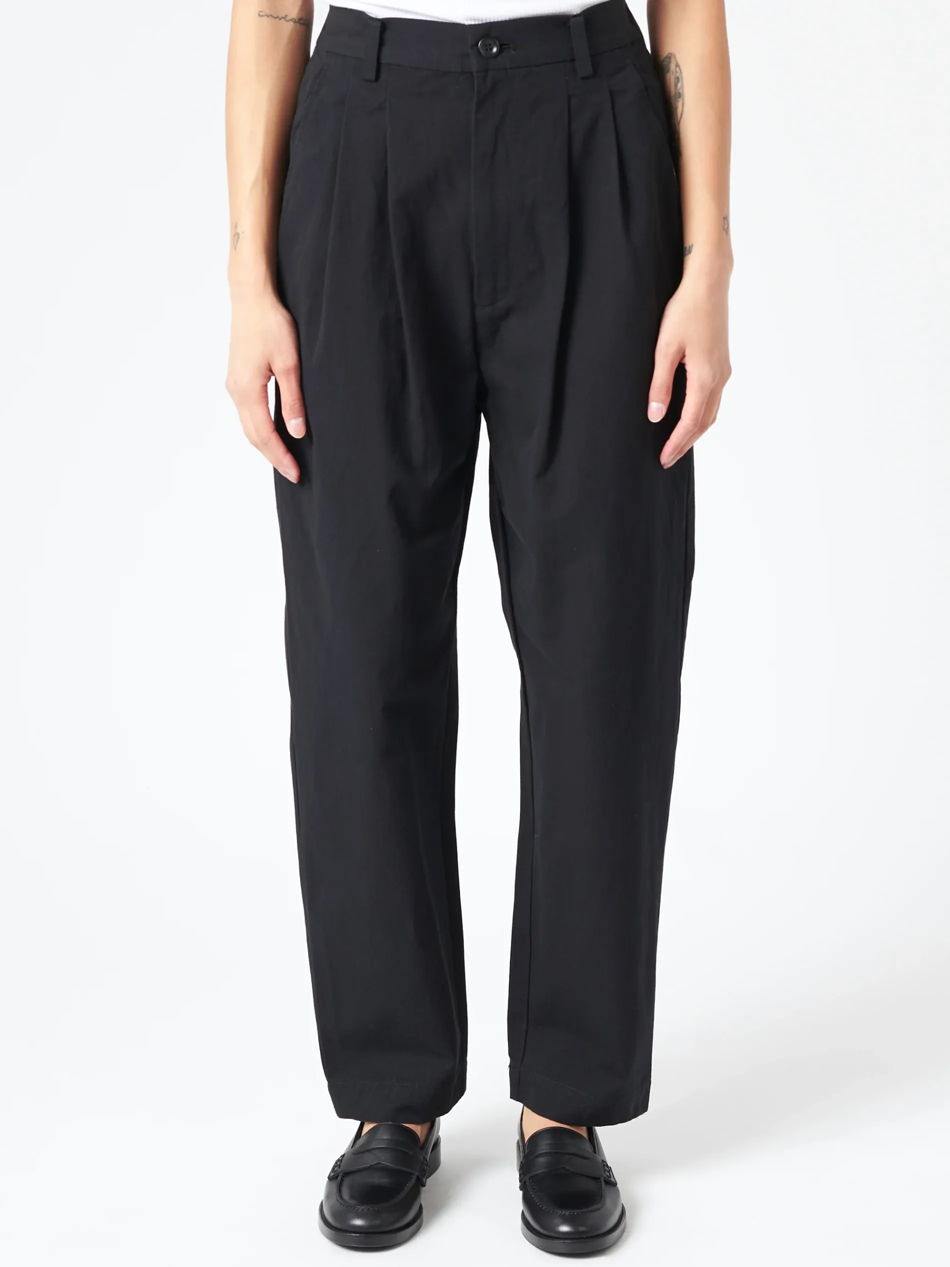 Sarahwear pleated-front tapered pants made from crisp cotton weather cloth, a densely woven fabric with firm structure.