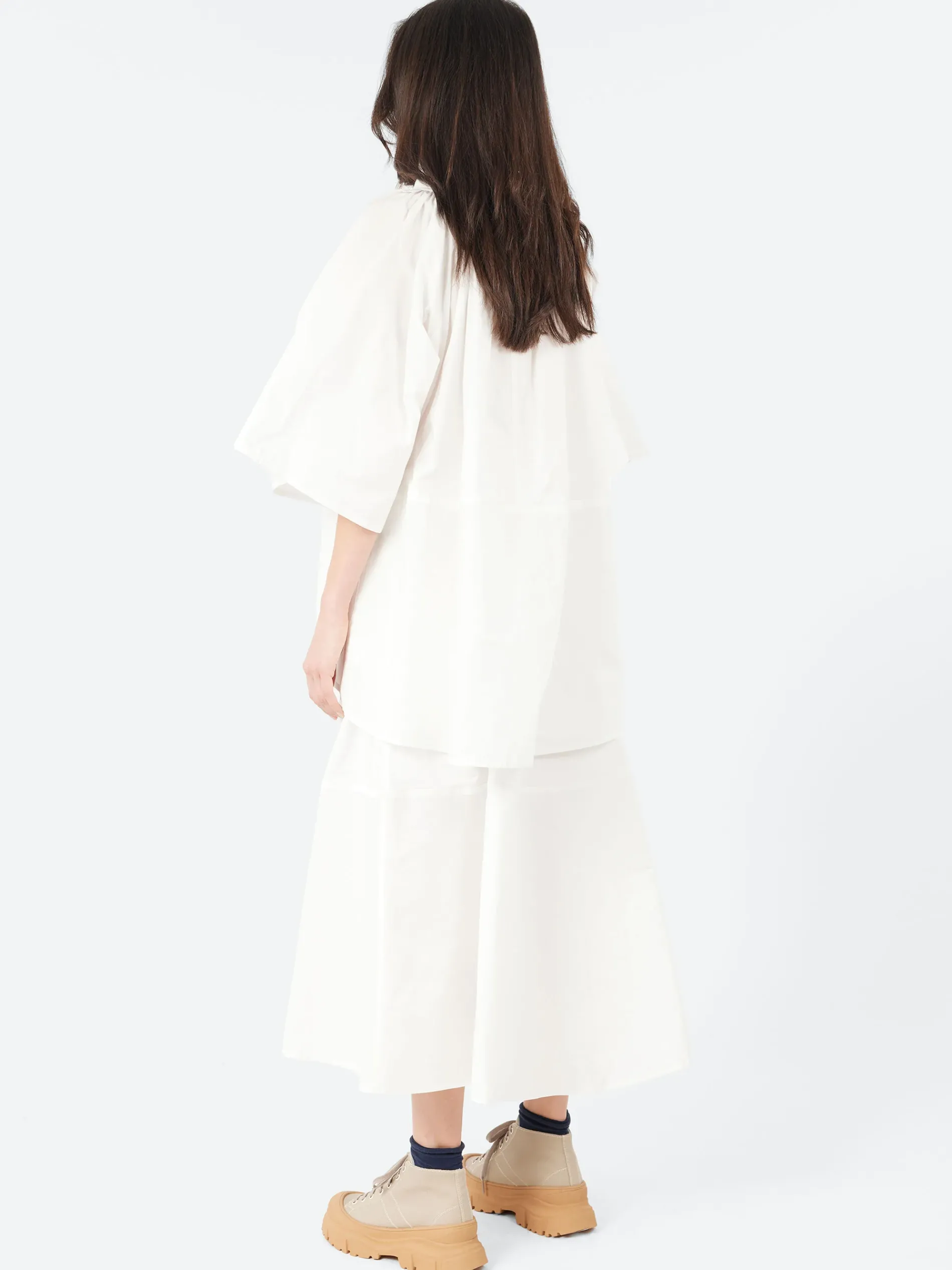 The Sofie D’Hoore Barcelona Top is a cotton top featuring a gathered neckline and puffed sleeves. It offers a little extra length at the back for a flattering silhouette. The sleeves can be rolled up and fastened at the shoulder, allowing for a versatile style that can be customized to your look.