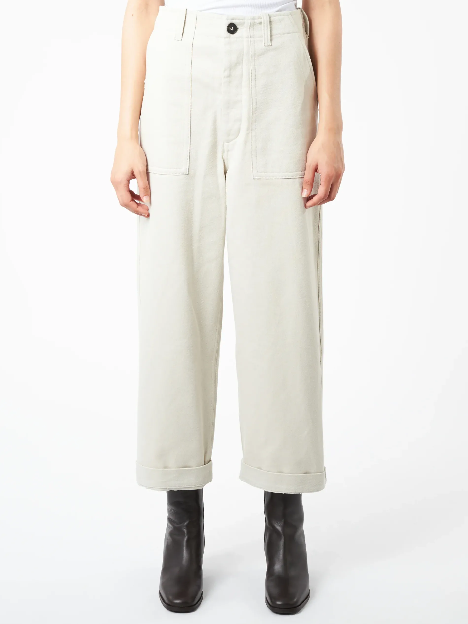 Sofie D’Hoore straight leg pants with oversized patch pockets in cotton gabardine. Finished with a slightly dropped crotch for a baggy fit.