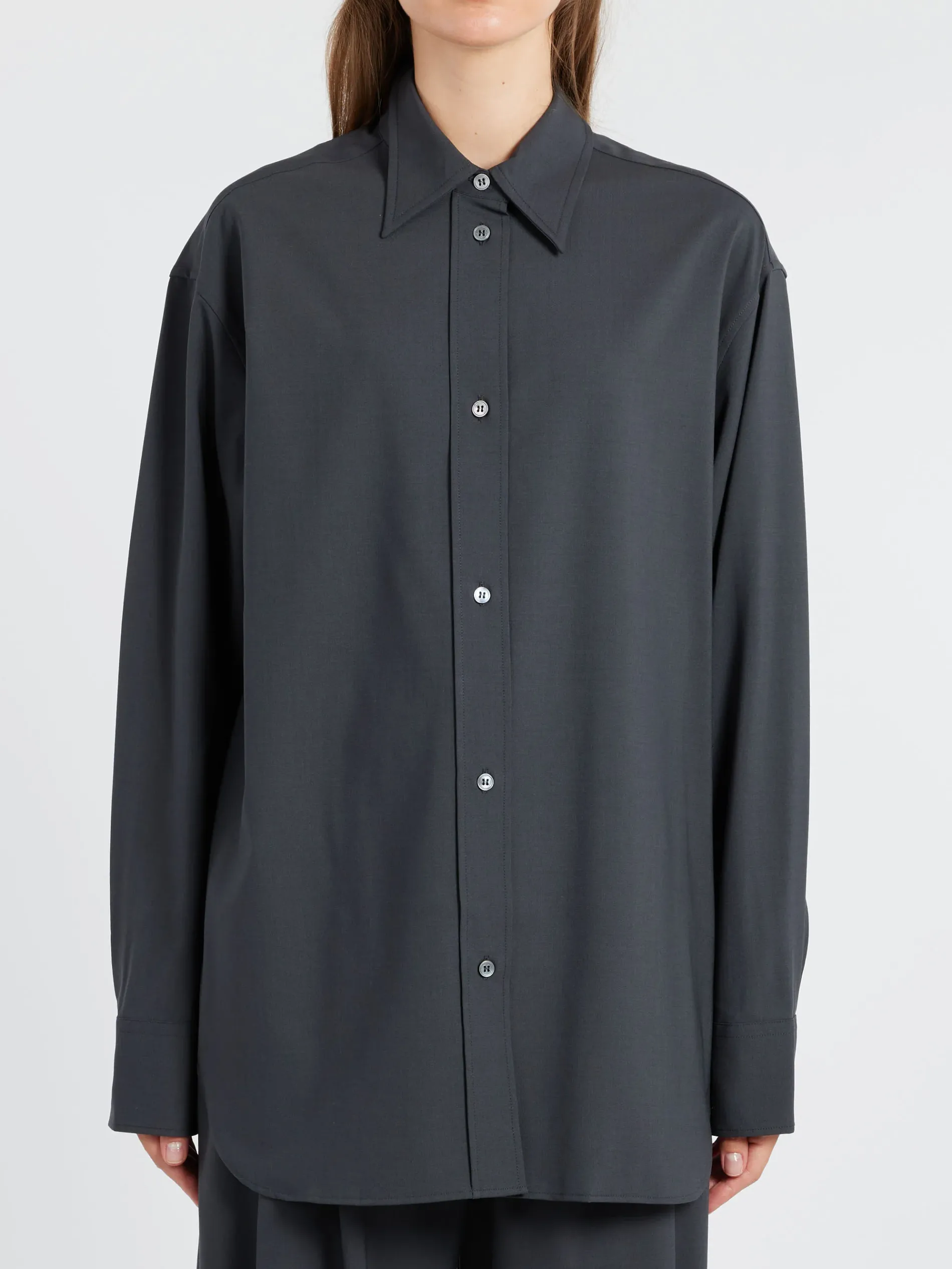 Cut from fluid technical wool, the Santos shirt is based on a block from Studio Nicholson men’s collection, with an oversized fit and classic detailing.