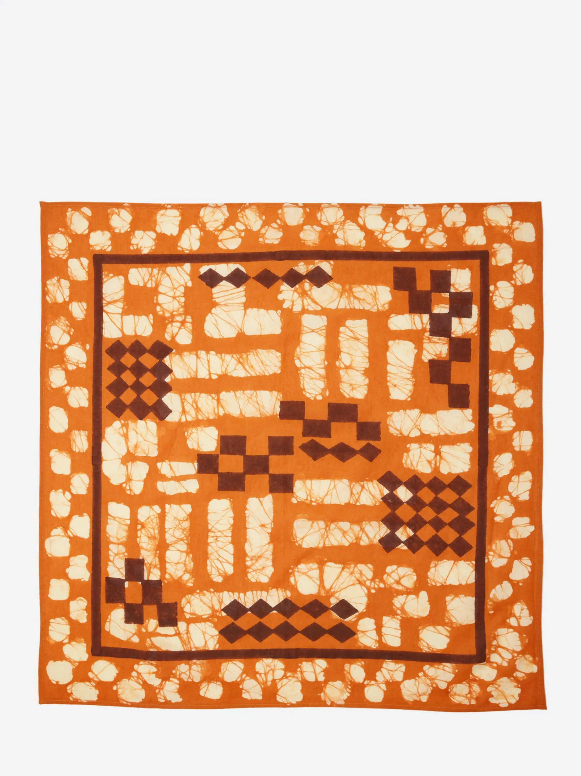The unique pattern on TOAST’s lightweight cotton bandana is created by artisans in India using two traditional hand techniques. First, a wax-resist batik is created by applying wax with brush strokes to the fabric before dyeing it. Once the fabric dries, the wax is removed, leaving a resist pattern that varies naturally from piece to piece. Then, a second dimension is achieved through block printing, using carved wooden blocks dipped in dye.