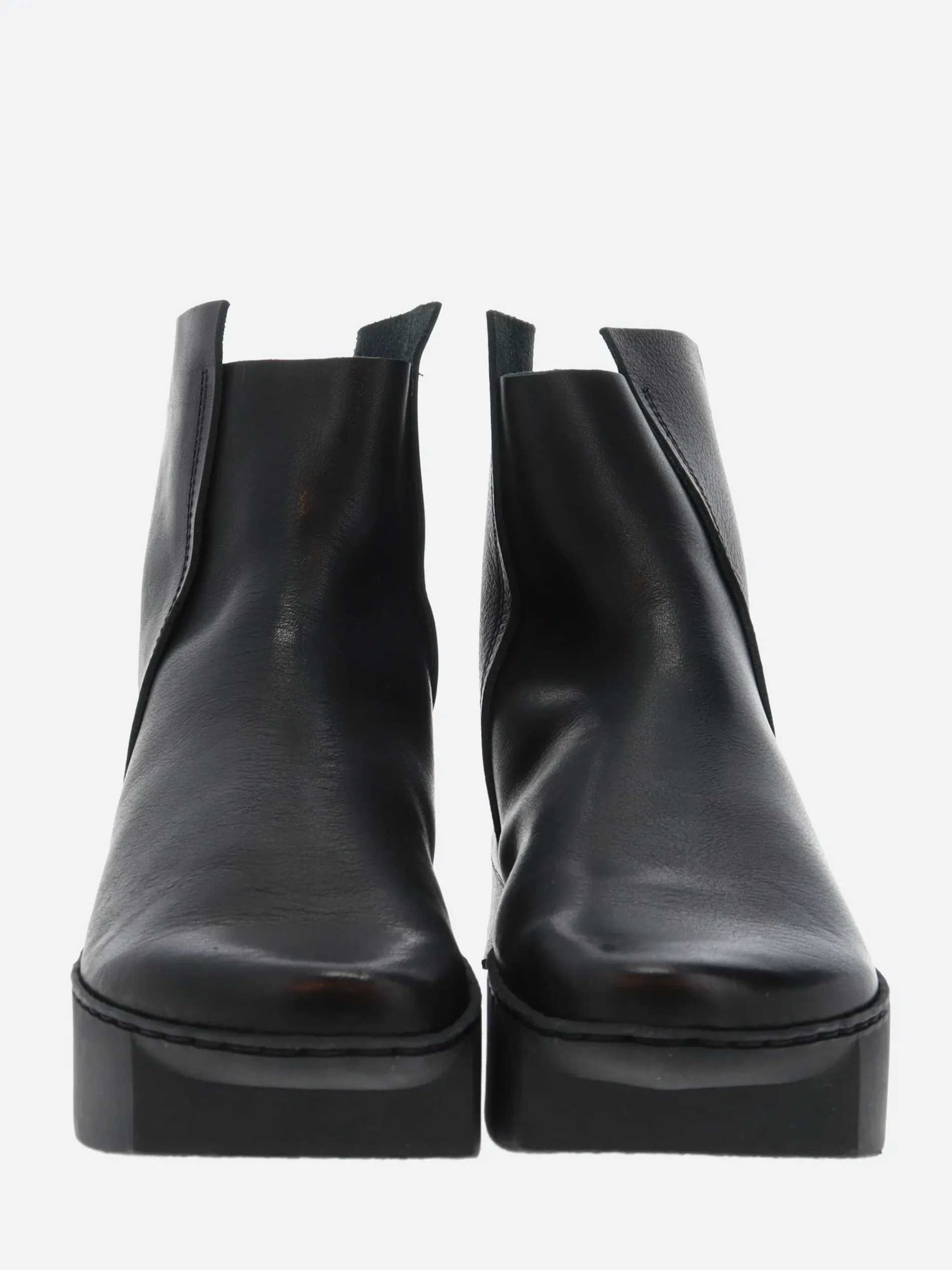 Flat bootie with rear zip fastener and rectangular appliqués on both the outside and inside.