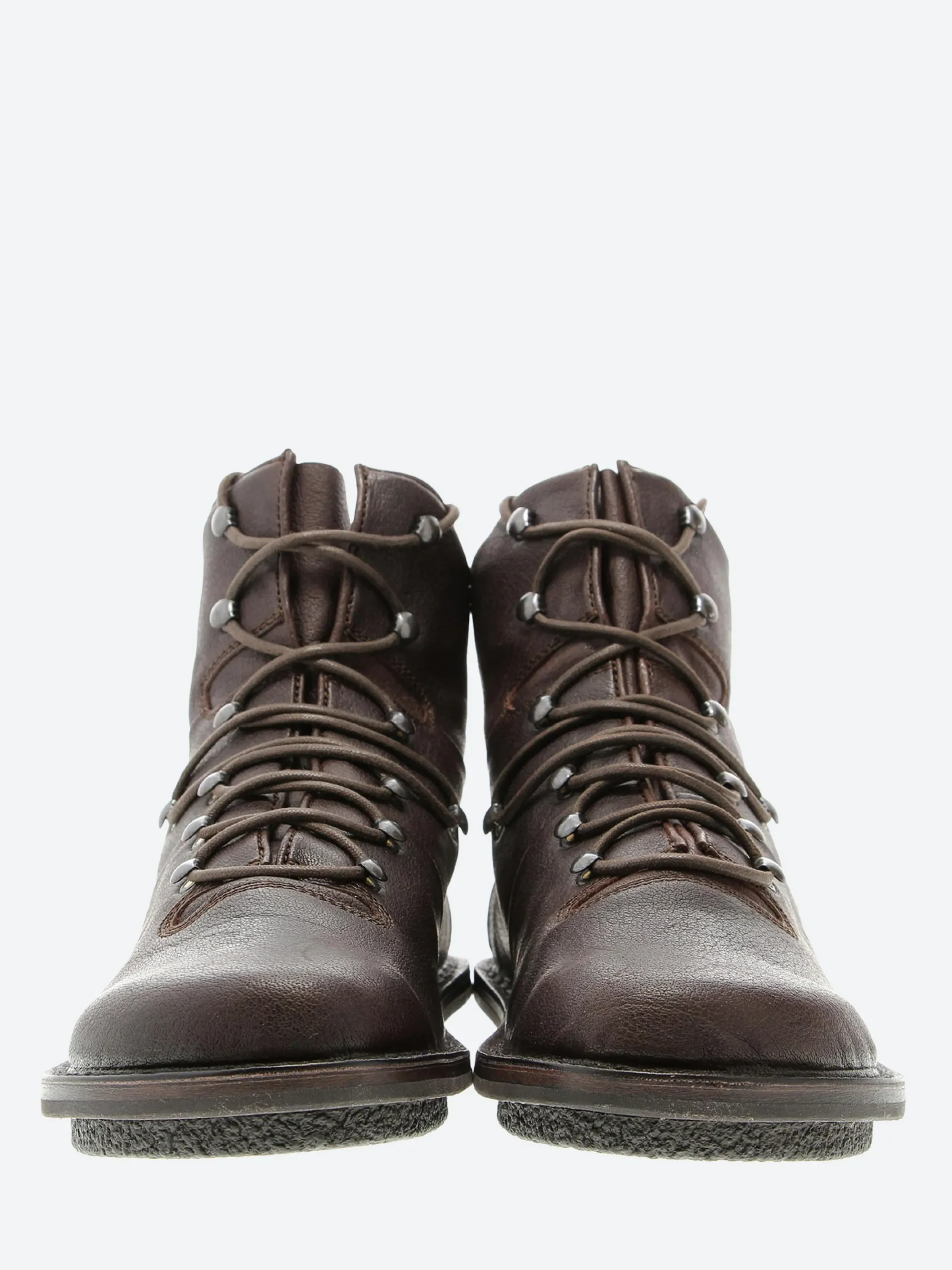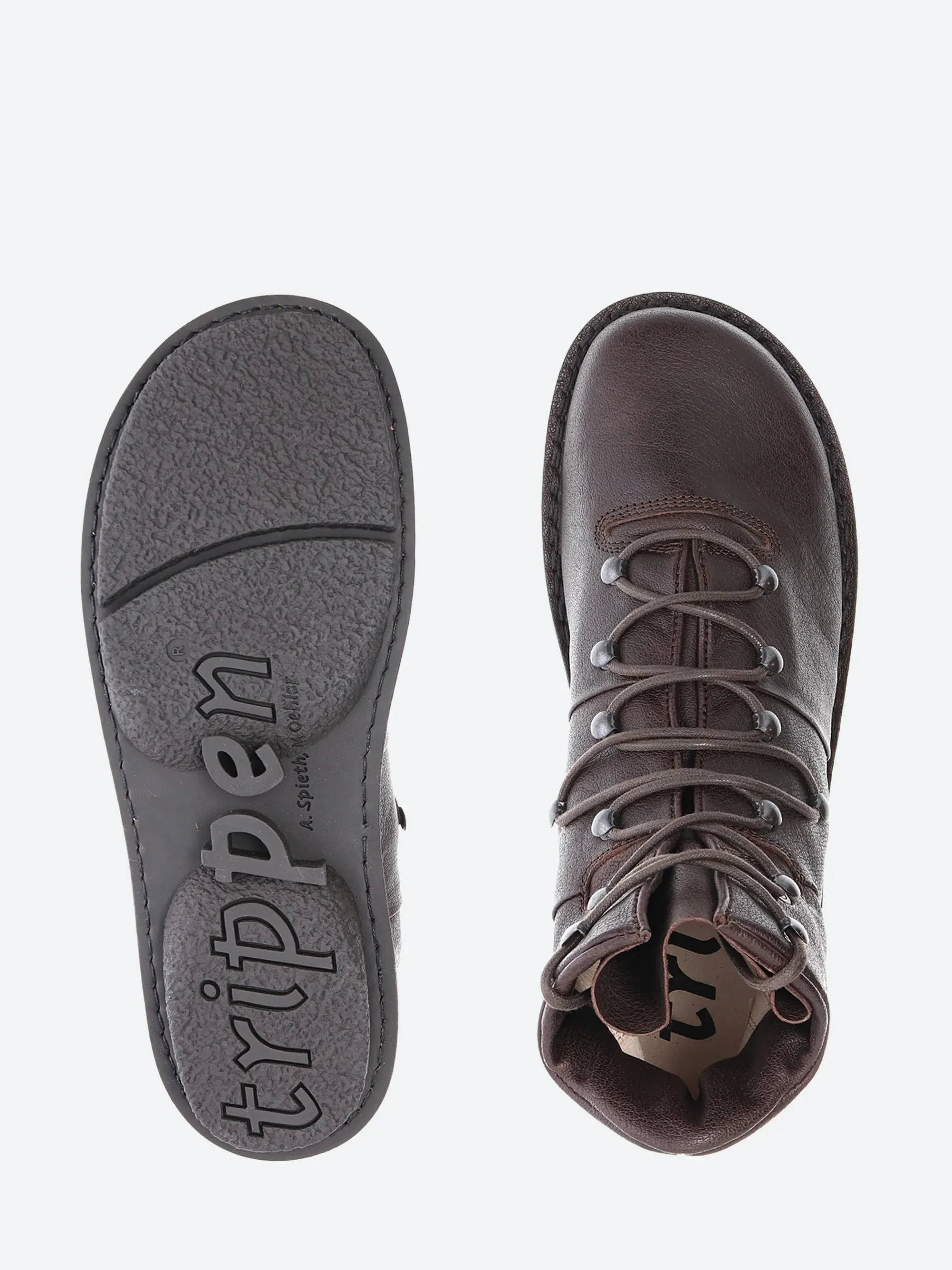 Trippen lace-up boot featuring hooks and eyes in the style of classic mountain boots.