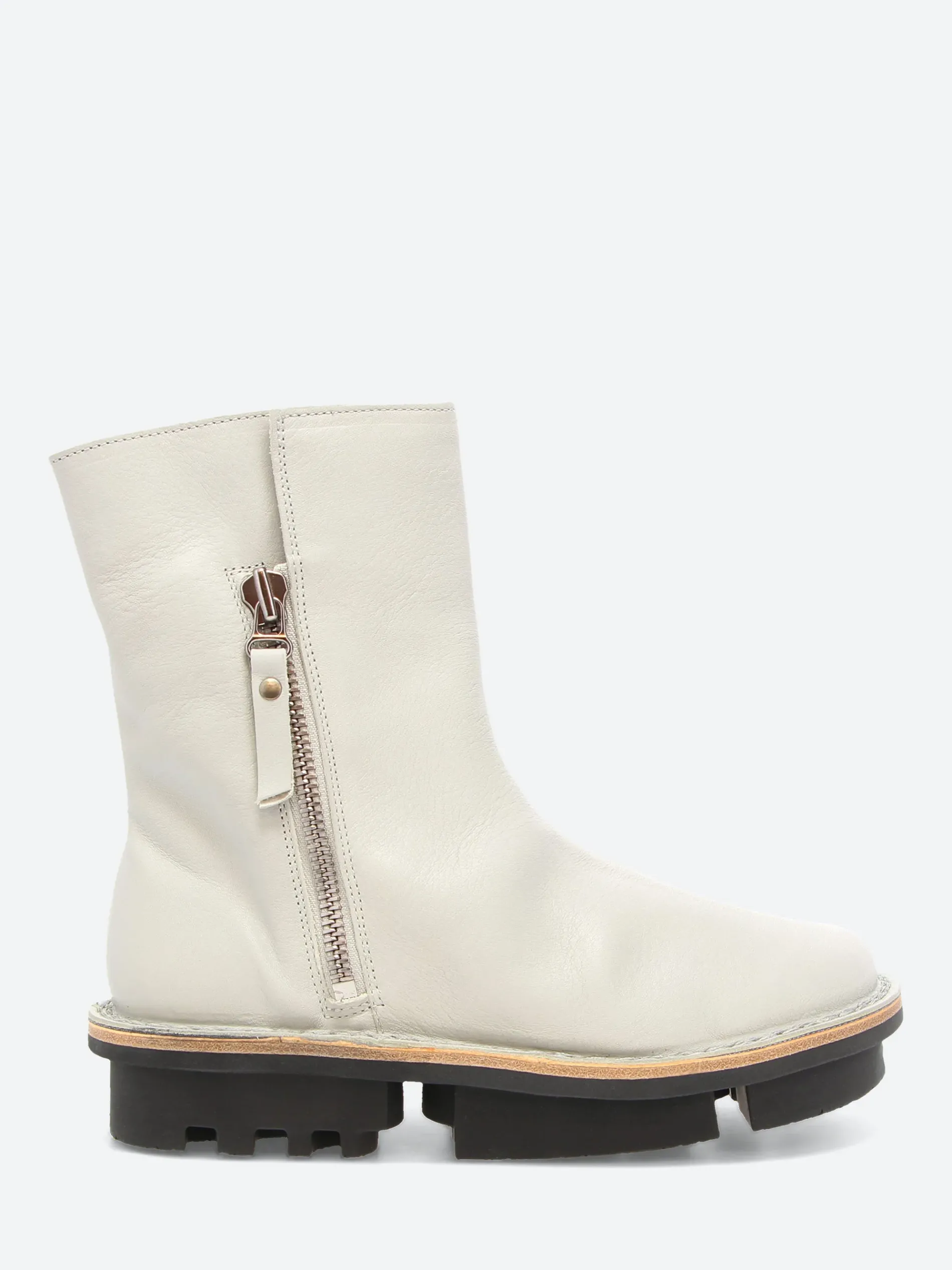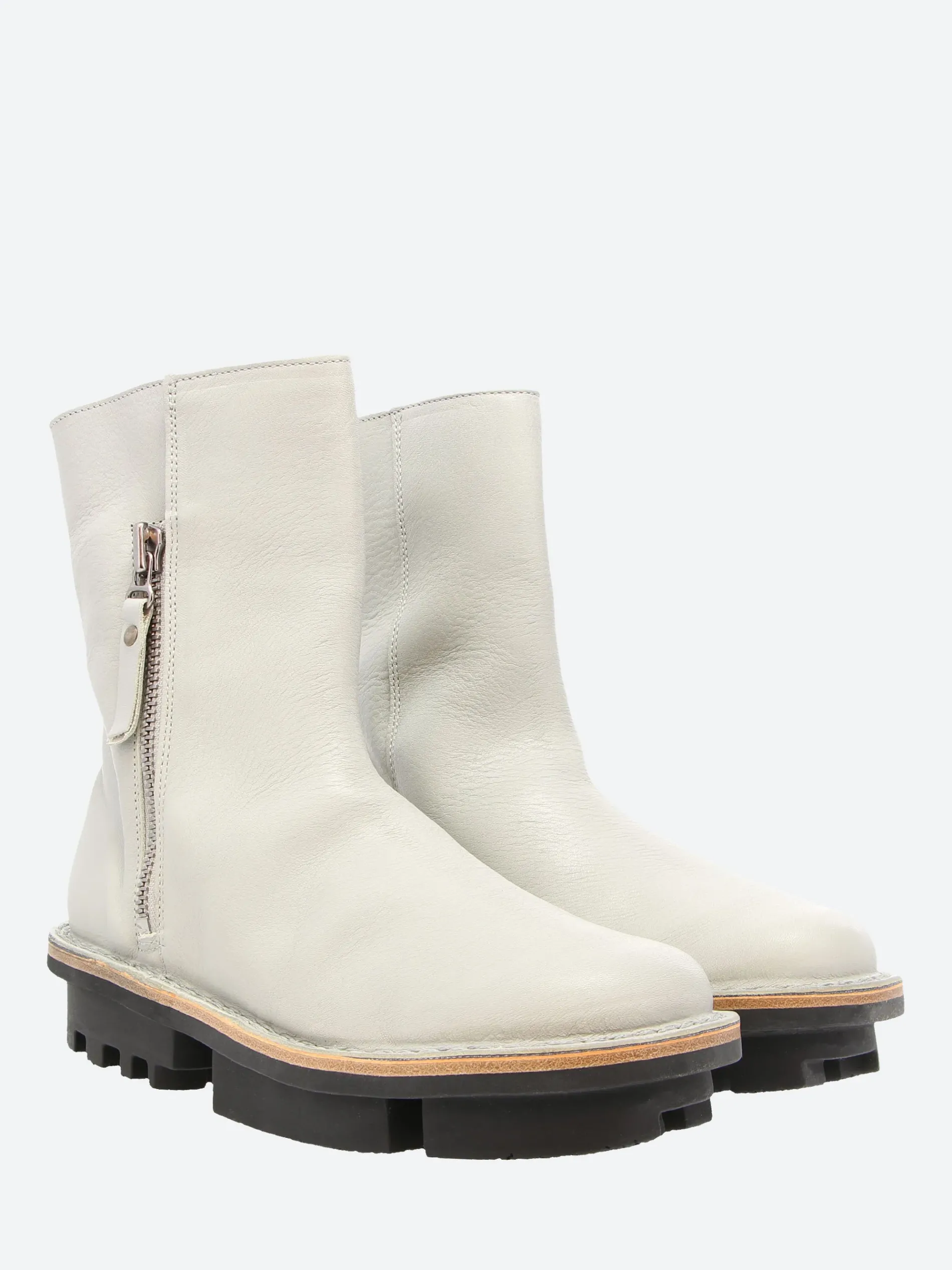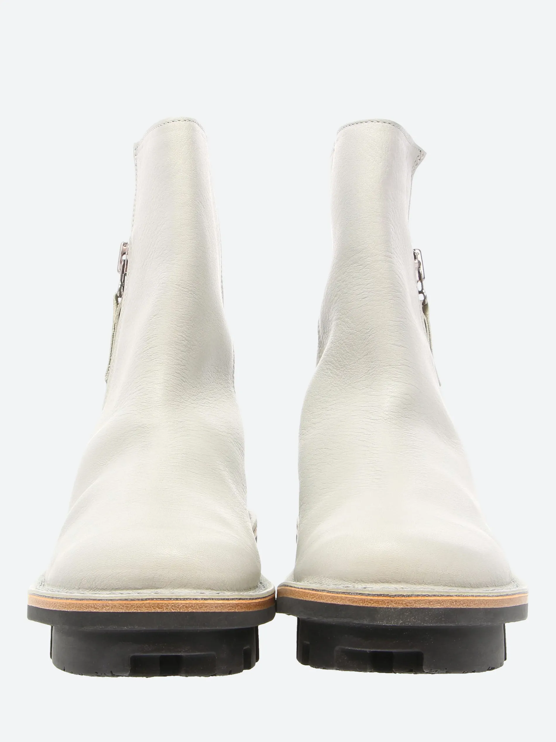 Trippen ankle boot with exterior metal zip fastening. Thanks to the large underlay and leather lining, the upper can be turned decoratively inside out at the top.