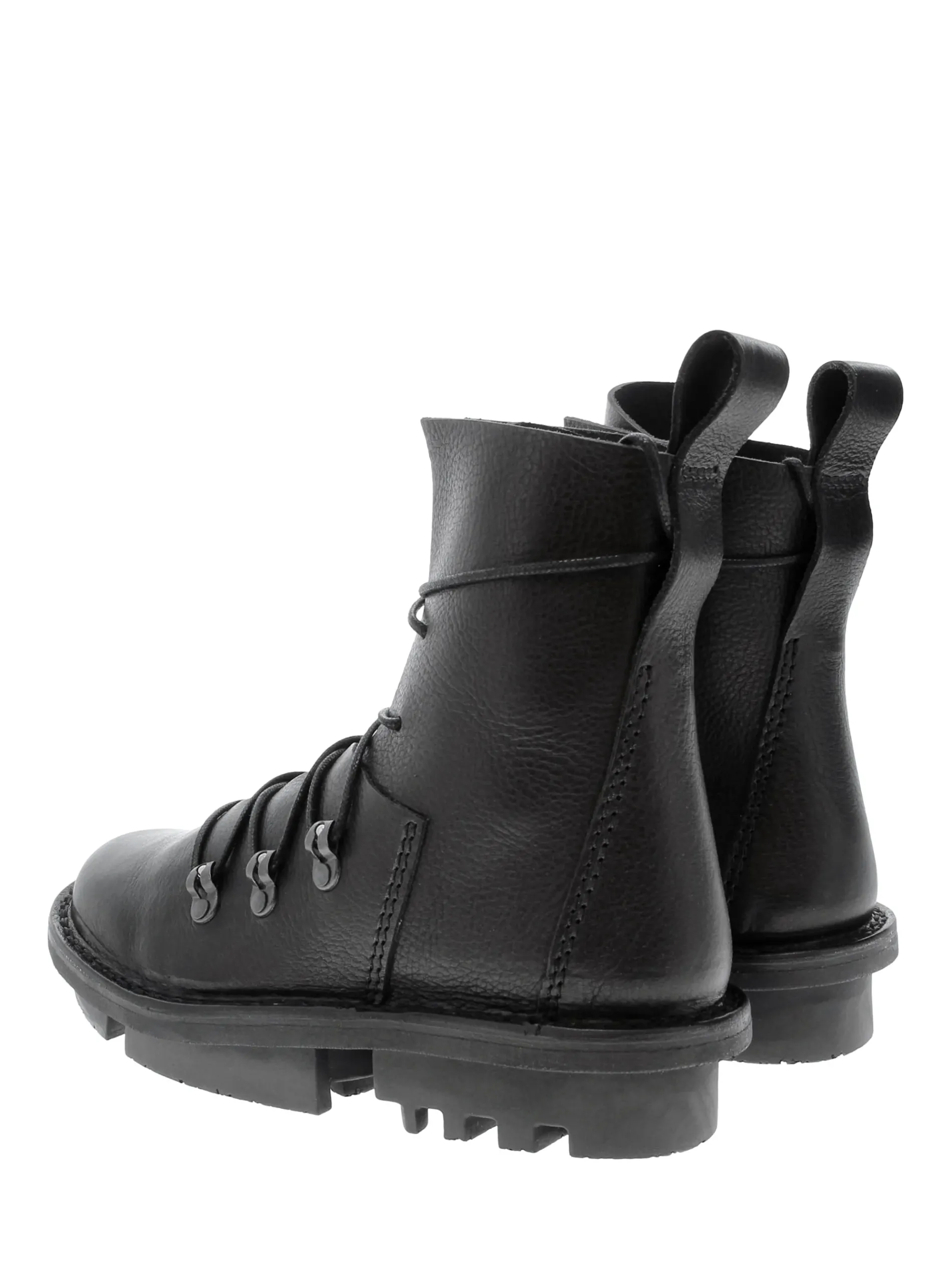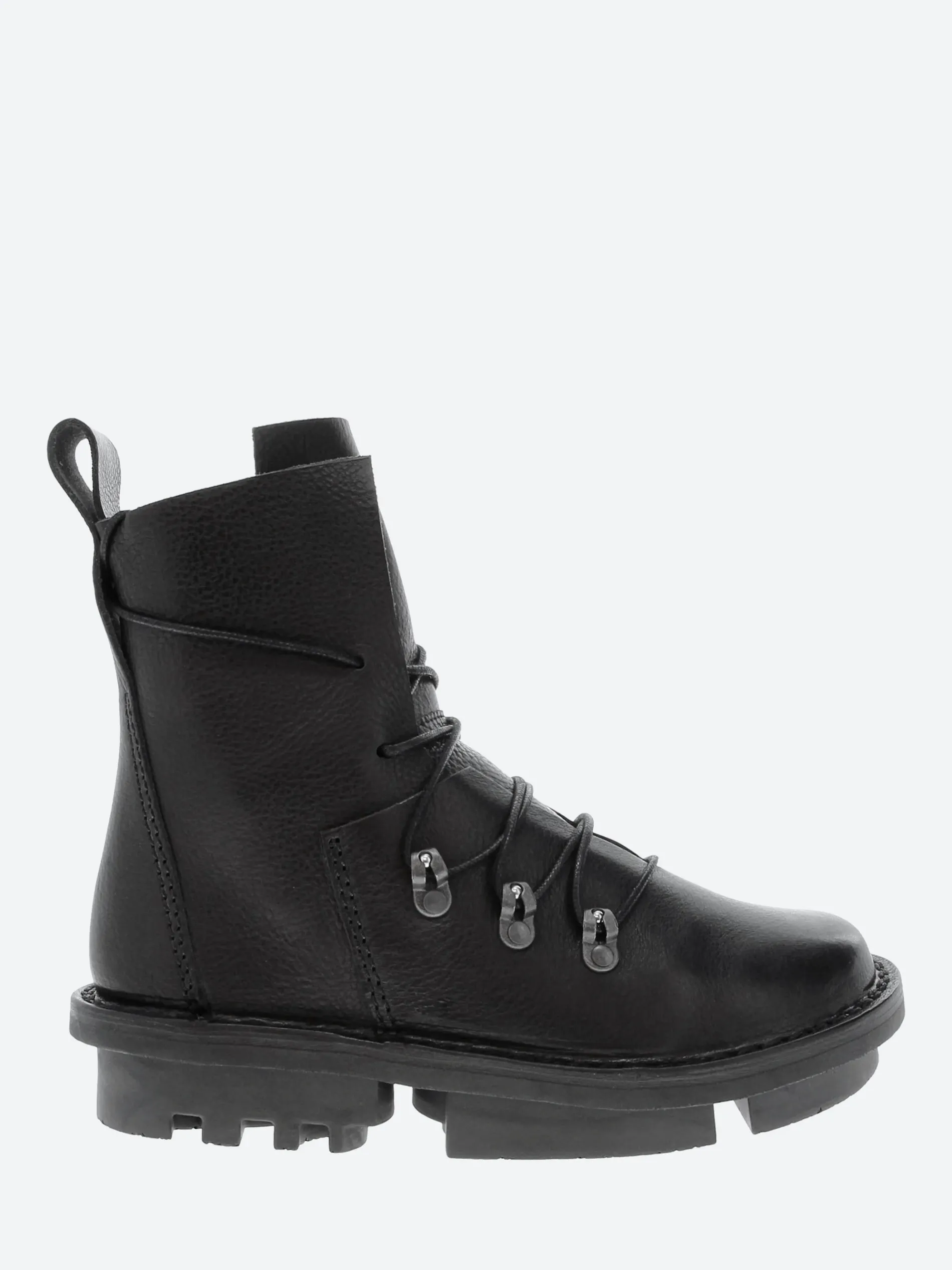 Rugged, lace-up boot with vertically stitched lines and an open, deconstructed form.