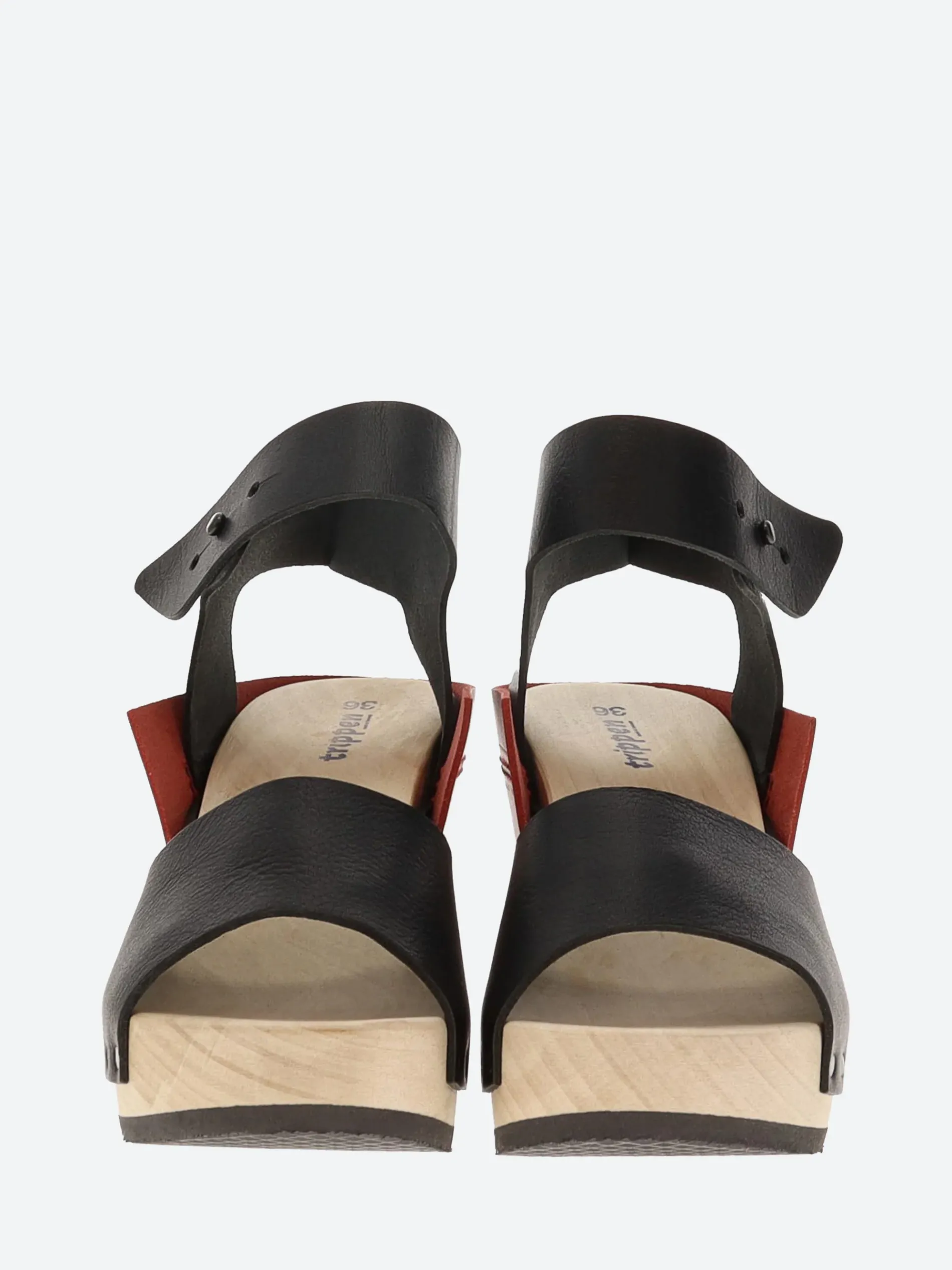 Trippen Wood Stand, this simple sandal on a high wooden sole is characterized by a dominant rectangle of leather wrapped around the heel.