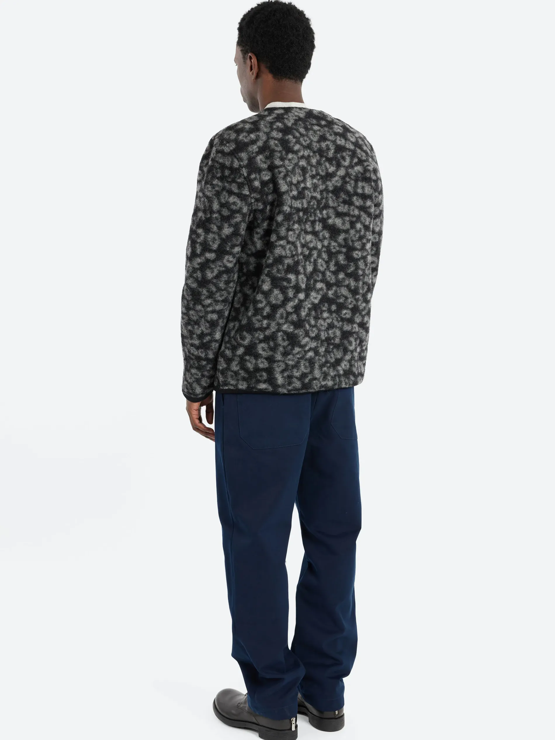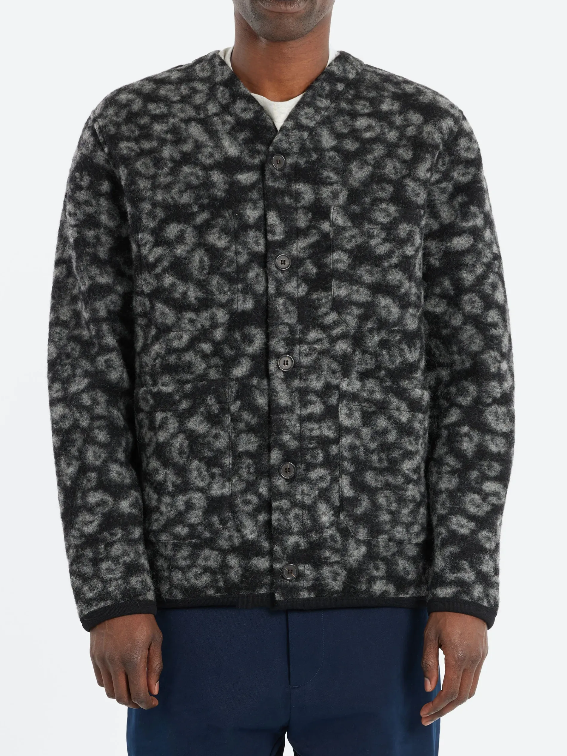 A Universal Works classic, an easy-to-wear cardigan with a self-bound button front, three outer patch pockets and a fourth on the inside.