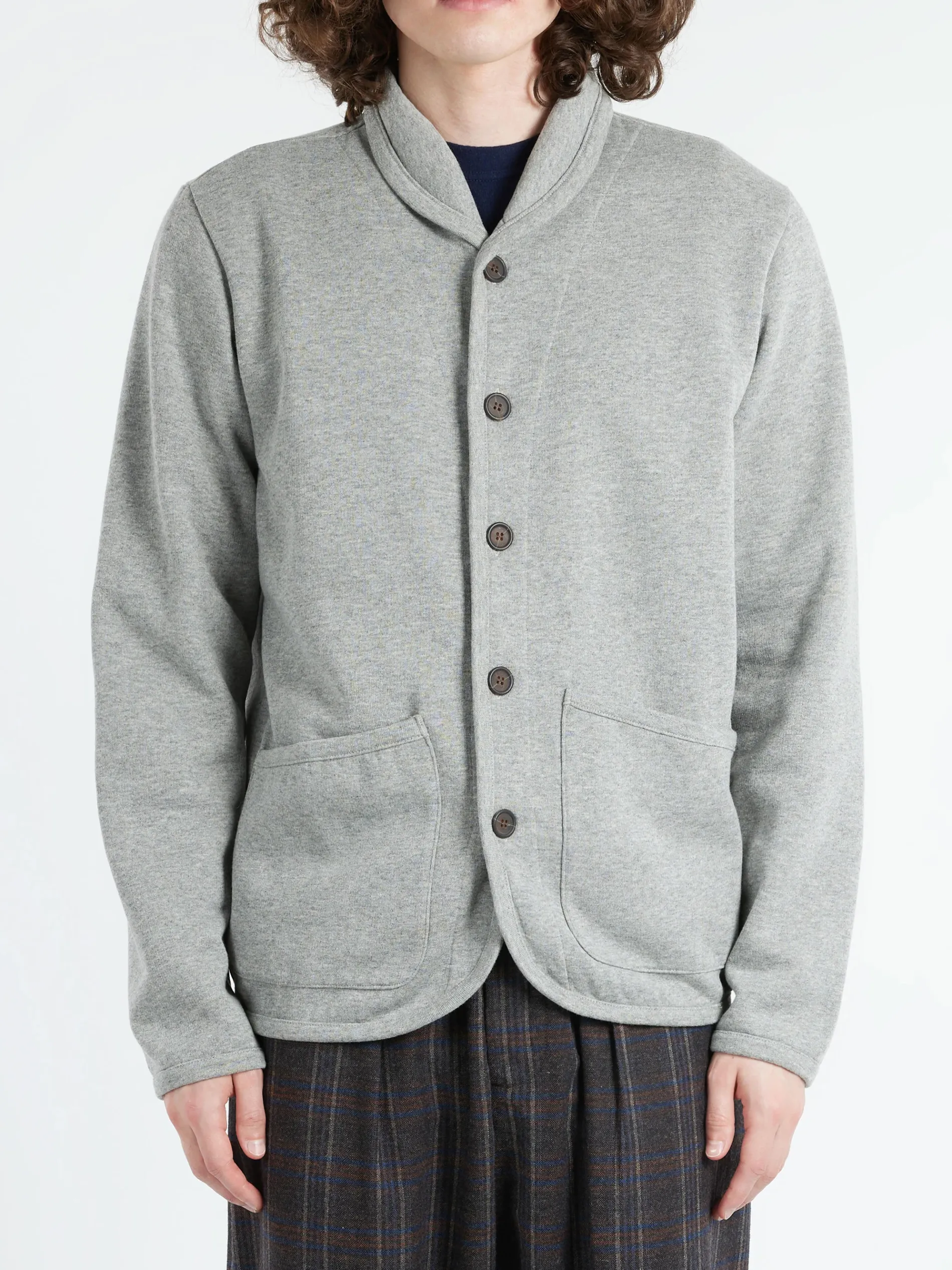 A simple cozy jacket with a shawl collar, patch pockets and cotton jersey bound edges.