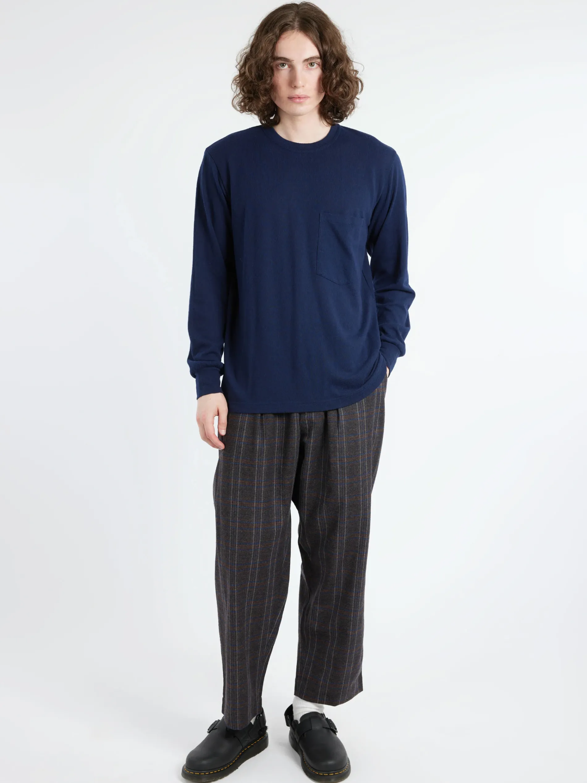 A loose cut, long sleeve t-shirt for an easy wear. Side split hem enables a slightly dropped rear hem, self-fabric cuffed sleeves and a front patch pocket.