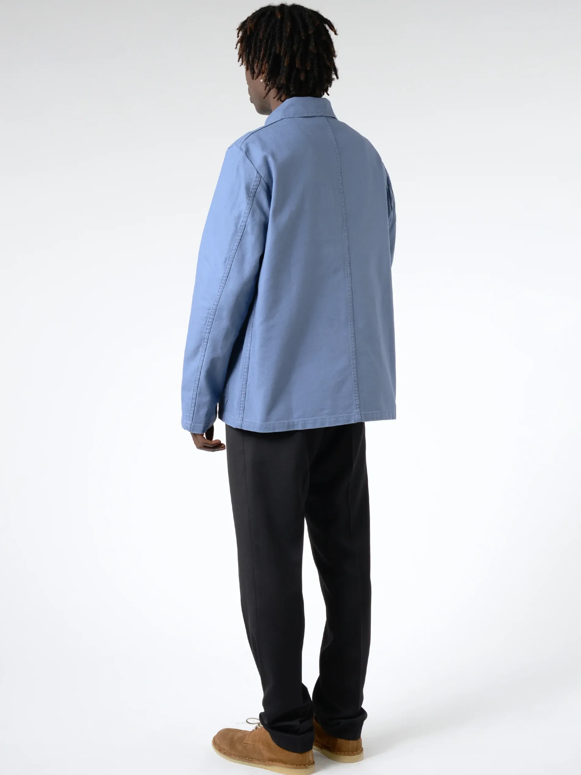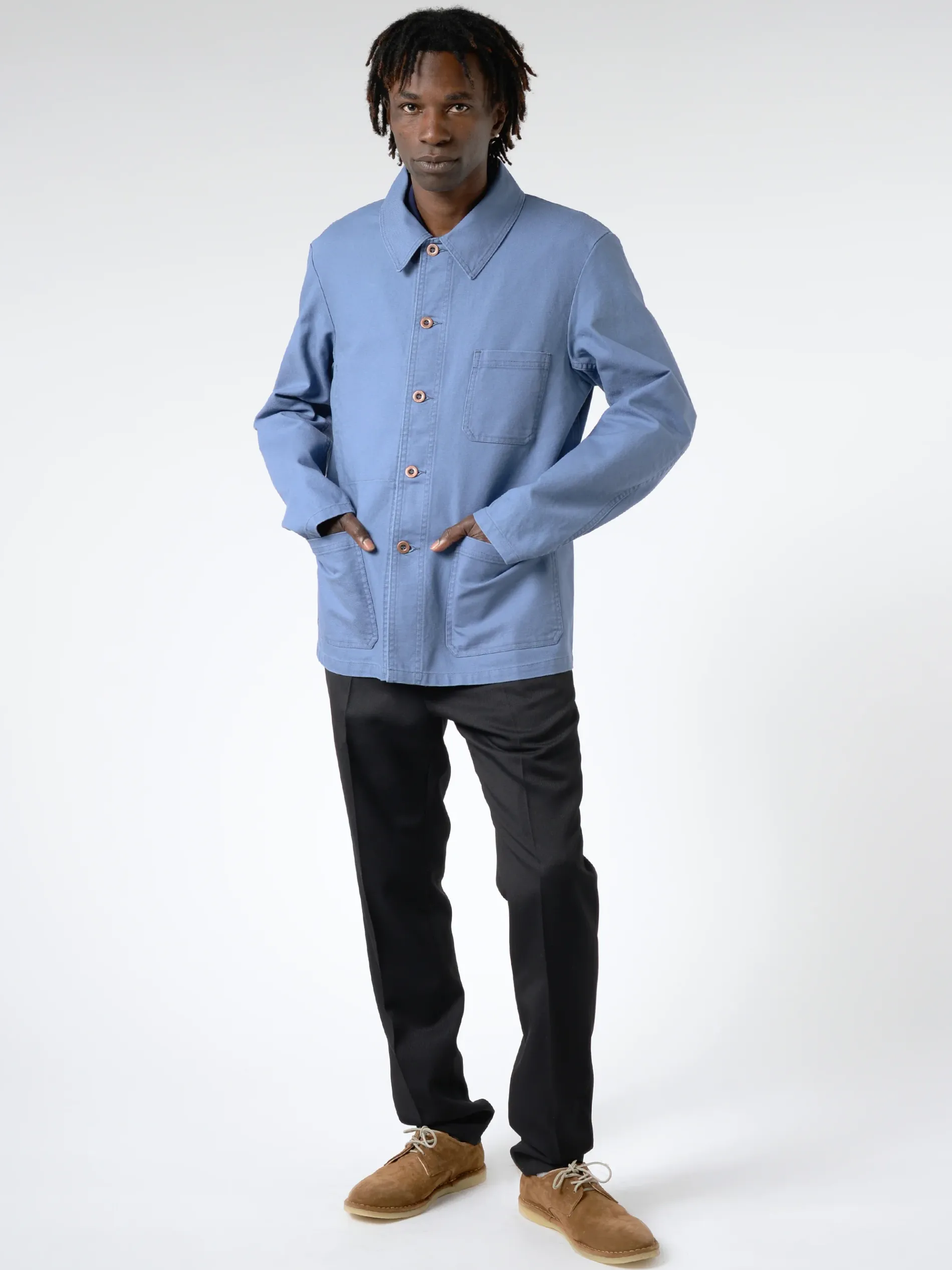 A classic French workwear jacket made from organic cotton dungaree twill. This fabric is made of two-ply warp yarns (two yarns twisted together), ensuring better resistance.