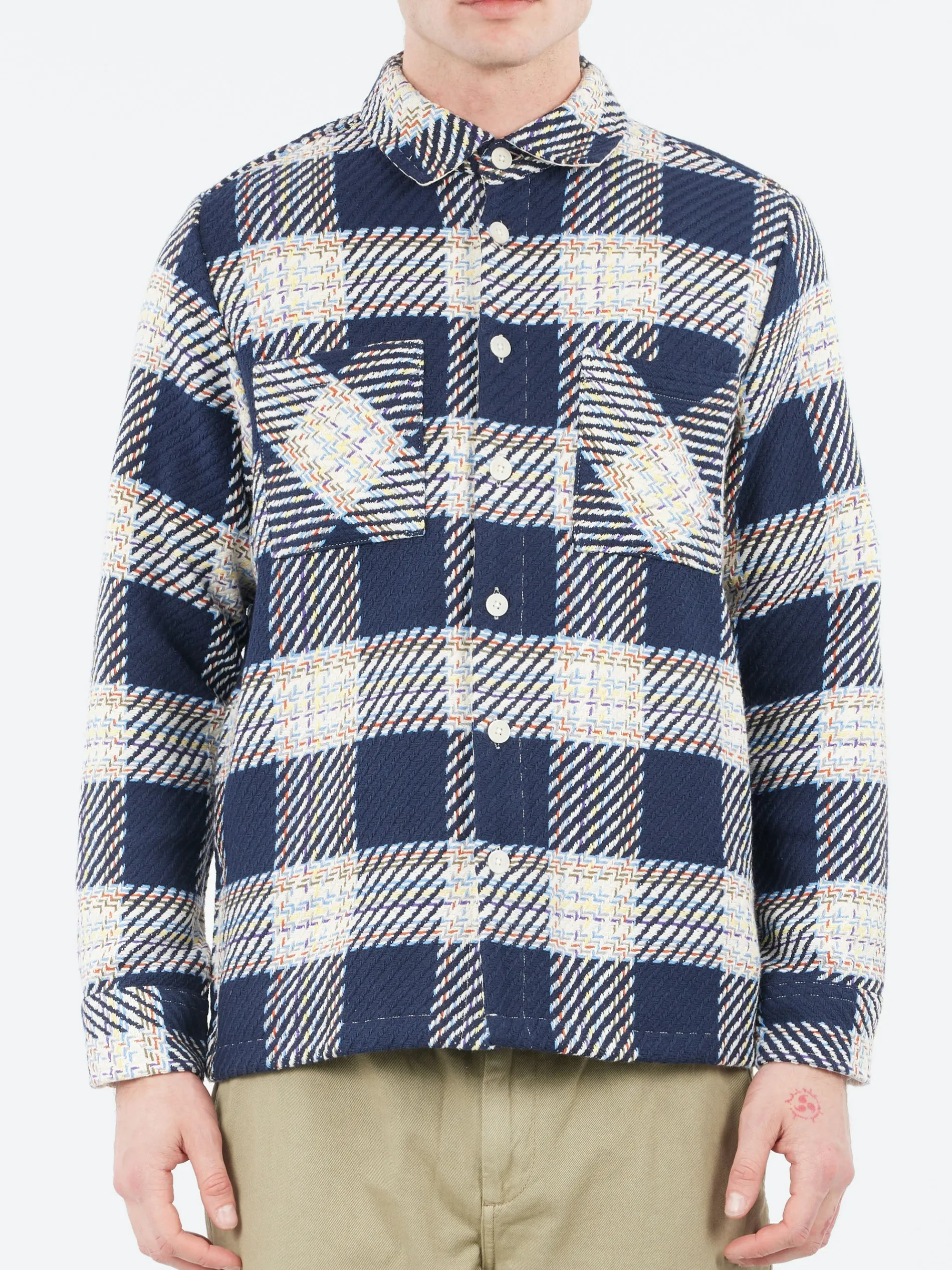 The Wax London signature piece. The Whiting, a year-round staple, returns in a new lake check woven design using mixes navy, ecru, red and yellow yarns. This fabric is made sustainably by a family-run French mill using recycled cotton to create an effortlessly wearable overshirt that combines timeless style with responsible craftsmanship.