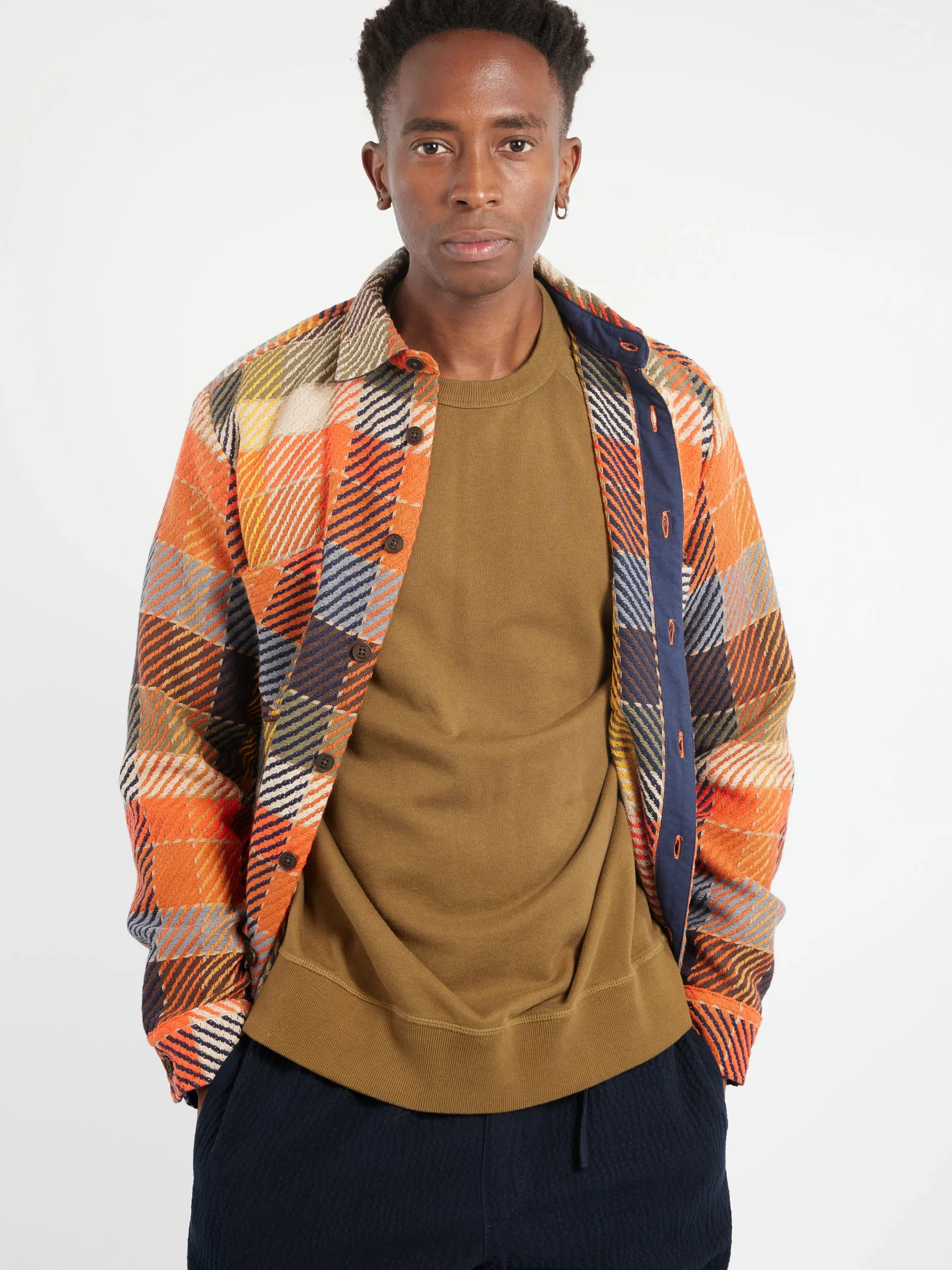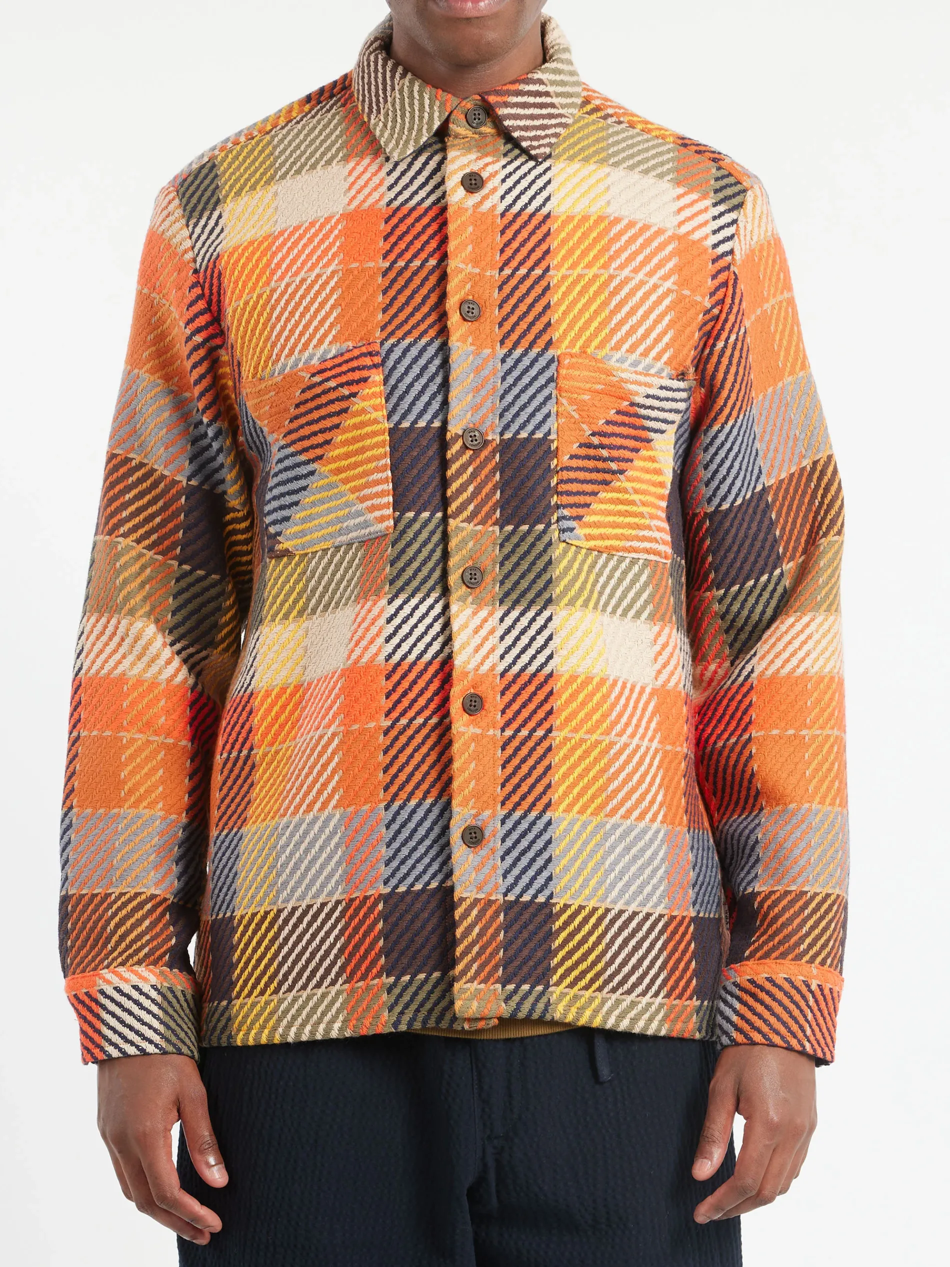 The Wax signature piece. The check mixes orange, navy and yellow yarns to create an effortlessly wearable overshirt. This fabric is made sustainably by a family-run French mill using recycled cotton and features environmentally-friendly Corozo nut buttons and front patch pockets.