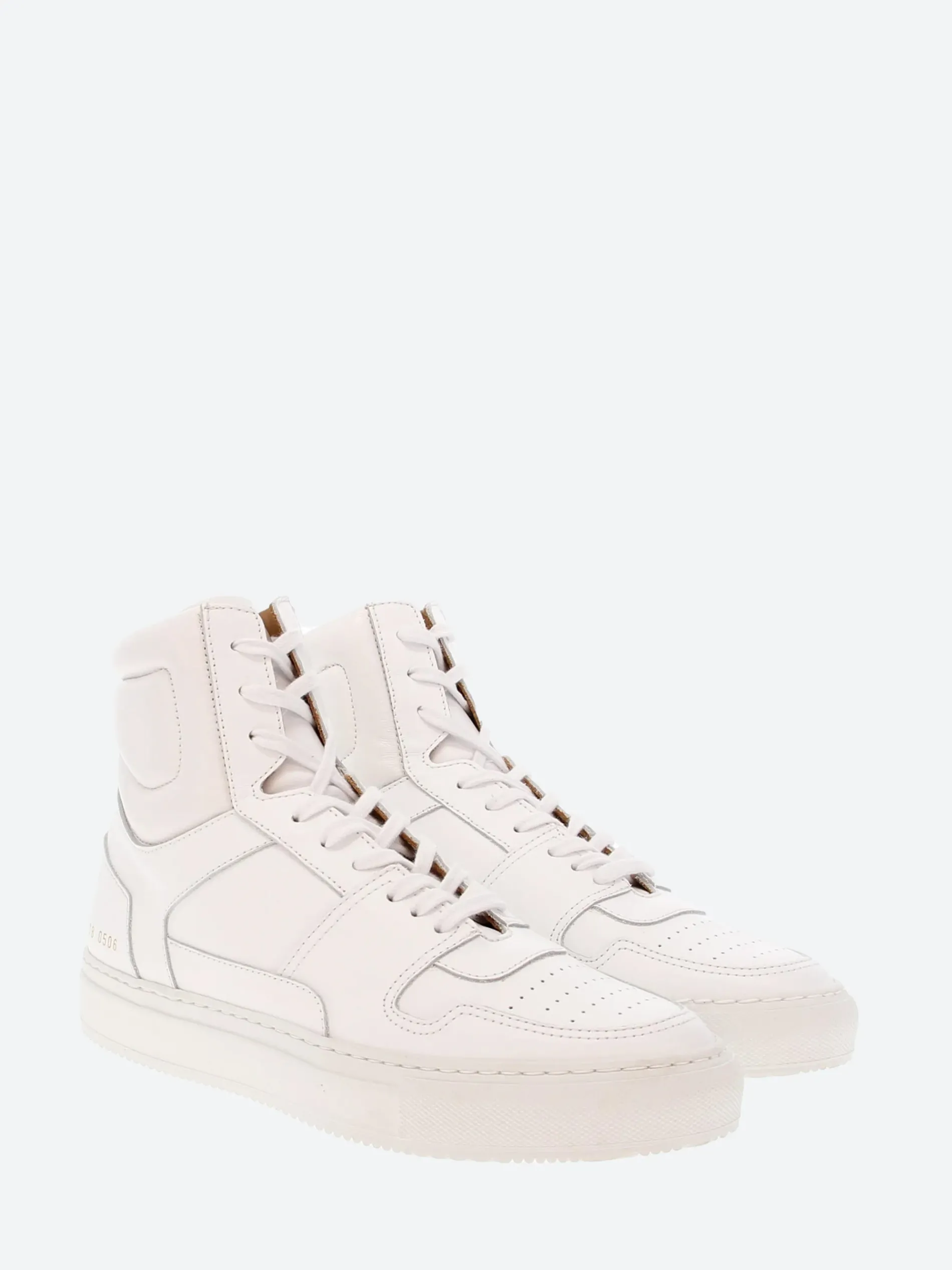 Woman by Common Projects lace-up high top sneaker. Using top grain leather for the upper and a full leather lining makes this a luxury Italian made sneaker. The clean lines and minimal gold branding exemplify everything the brand stands for.