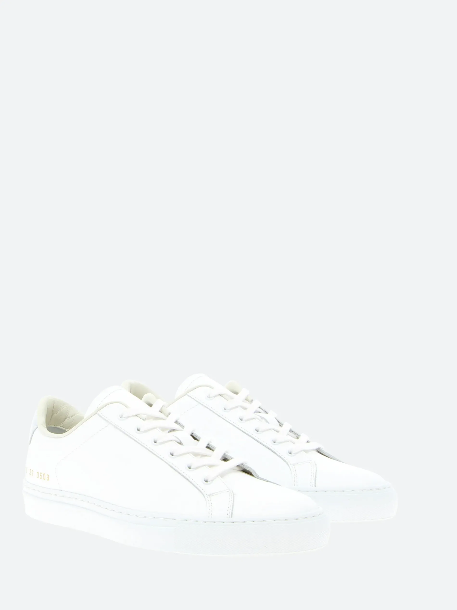The Retro Classic sneakers by Common Projects feature a timeless low-top silhouette with the brand’s signature foiled motif on the sides. These minimalist sneakers are crafted from supple leather with a polished finish. The contrasting heel cap adds a touch of distinction. Made in Italy, these sneakers combine comfort and high-end craftsmanship for a standout look.