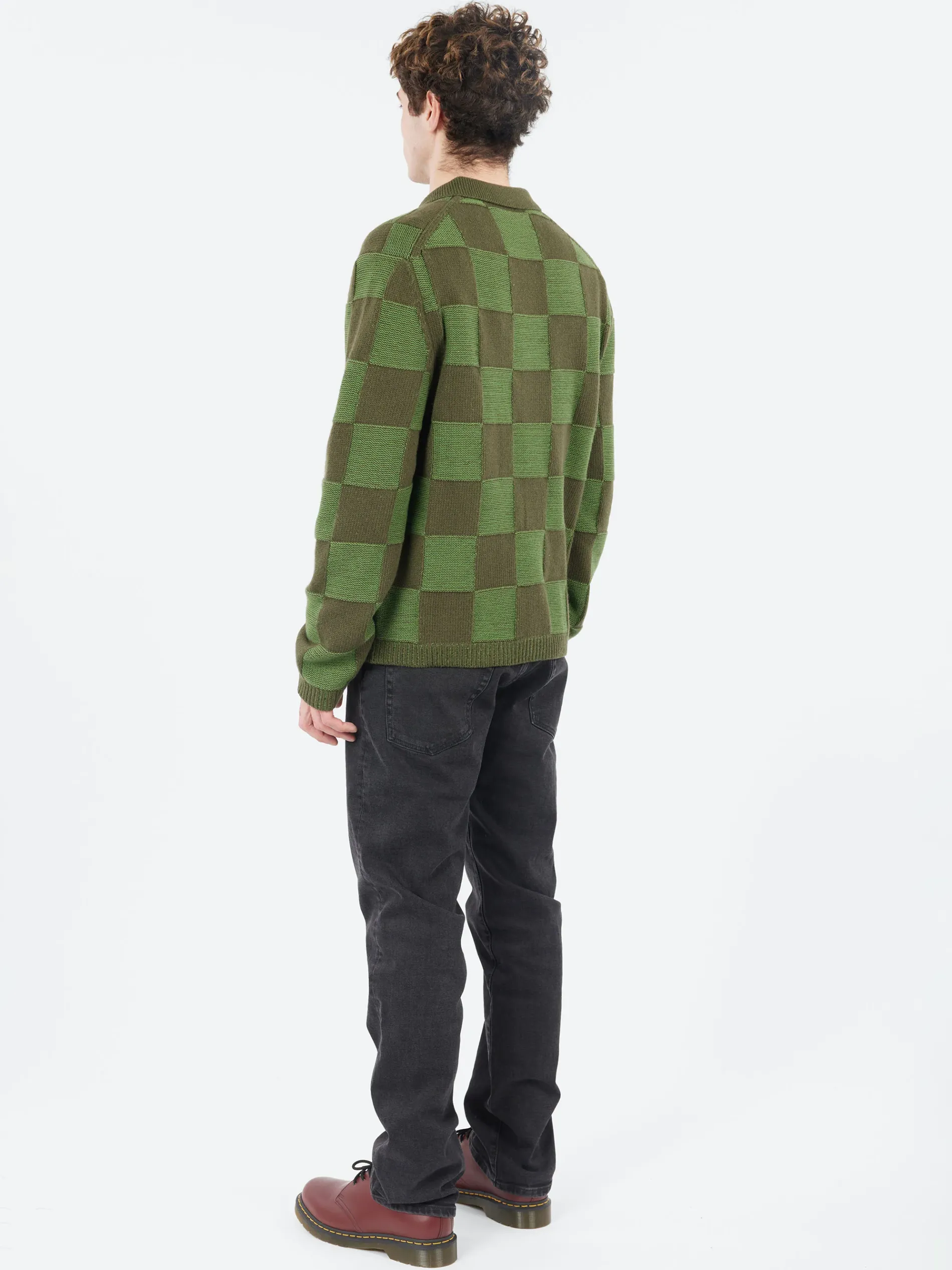 The YMC Baker Cardigan is a collared knitted cardigan made from a wool and cotton blend. It features a checkerboard plated knit design that adds texture and visual interest. The cardigan includes lower patch pockets for practicality and a corozo button fastening for an eco-friendly touch. A stylish and cozy piece, perfect for layering.