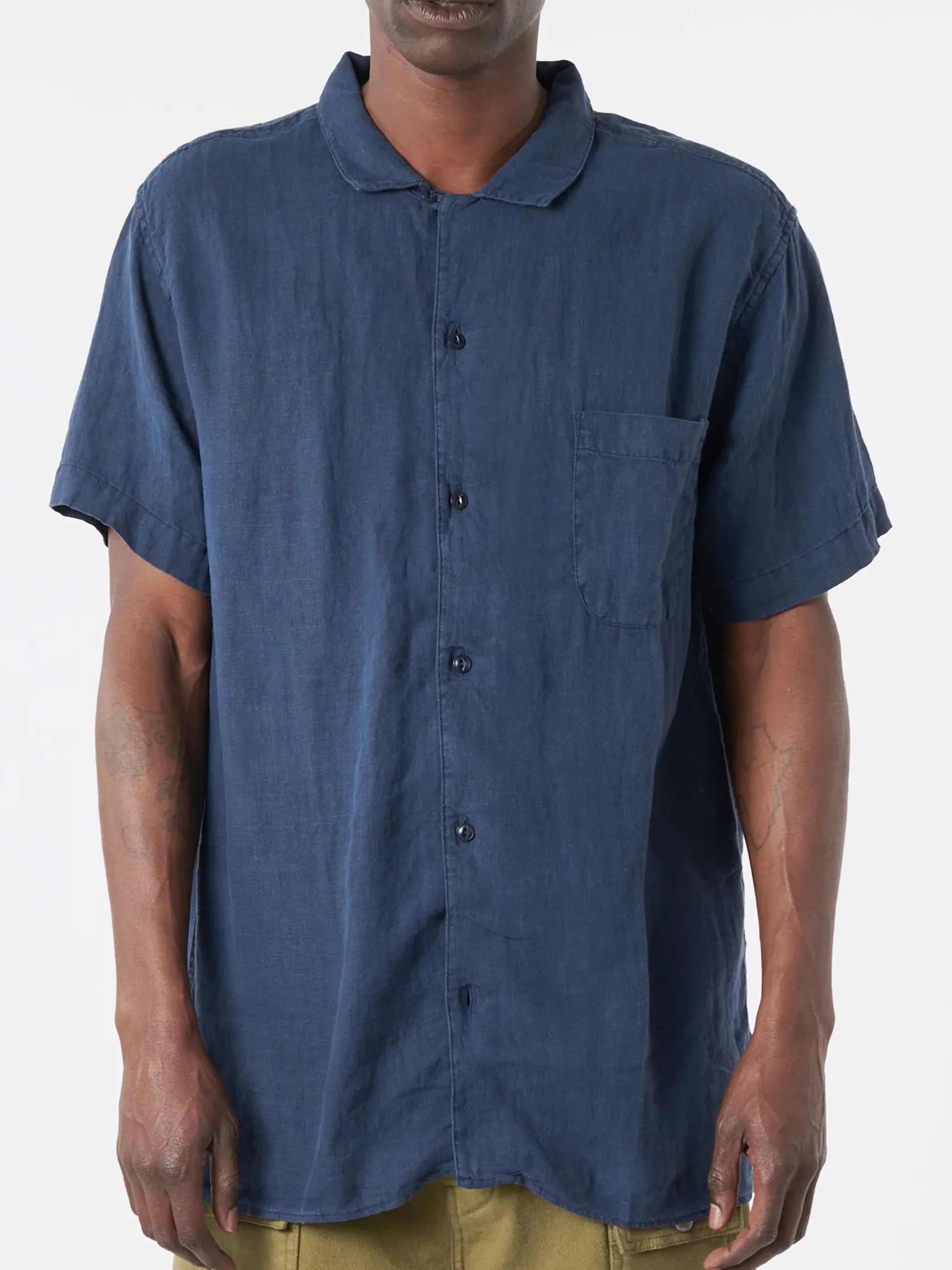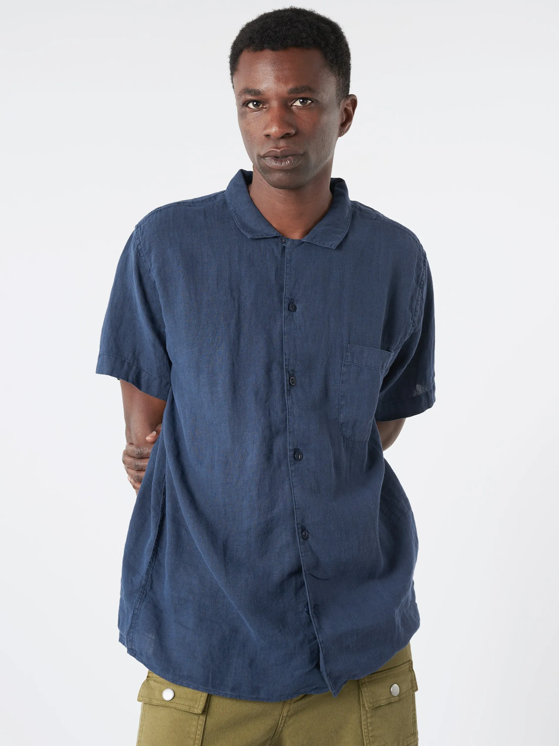 Boxy fit short sleeve shirt in garment dyed and washed linen.