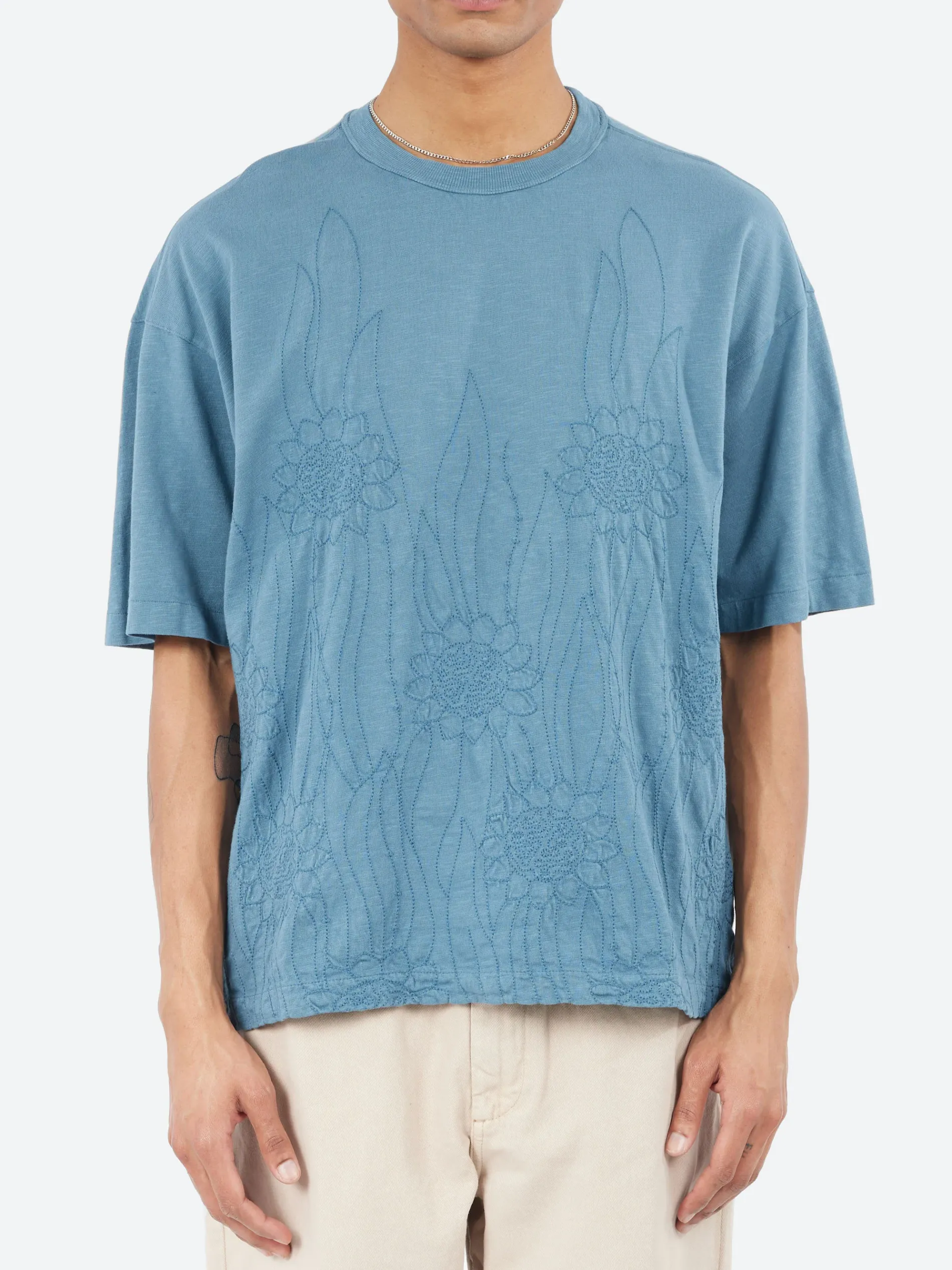 The YMC Triple T-shirt is made from midweight organic cotton jersey. It features a bound-style ribbed neckband for added durability, along with sunflower embroidery panels for a unique touch. The shirt also includes side seam vents for improved fit and mobility, all while providing an oversized fit for a relaxed, modern look.