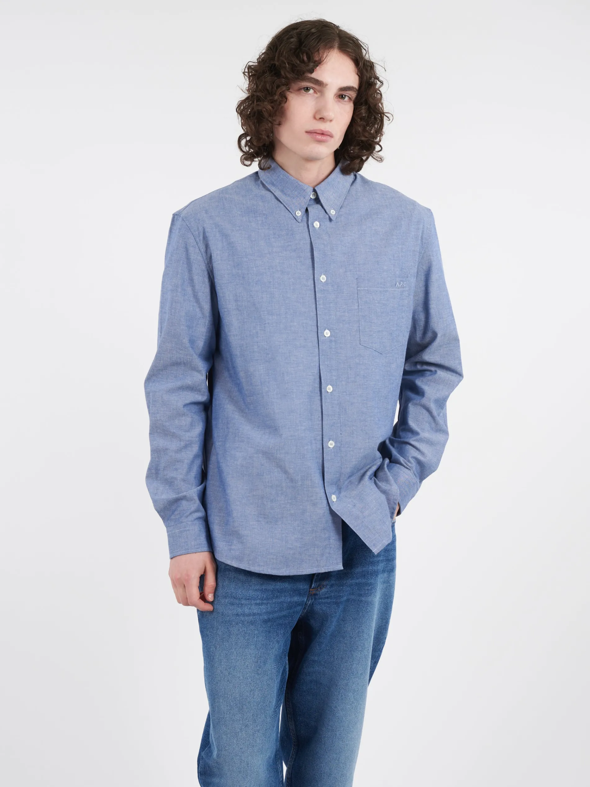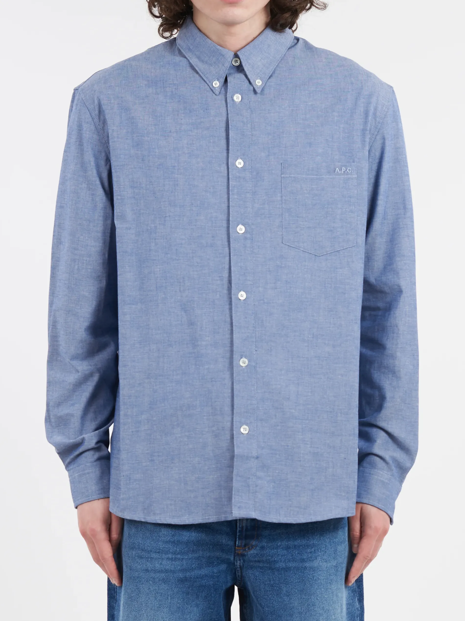 Casual shirt in indigo chambray with buttoned collar.