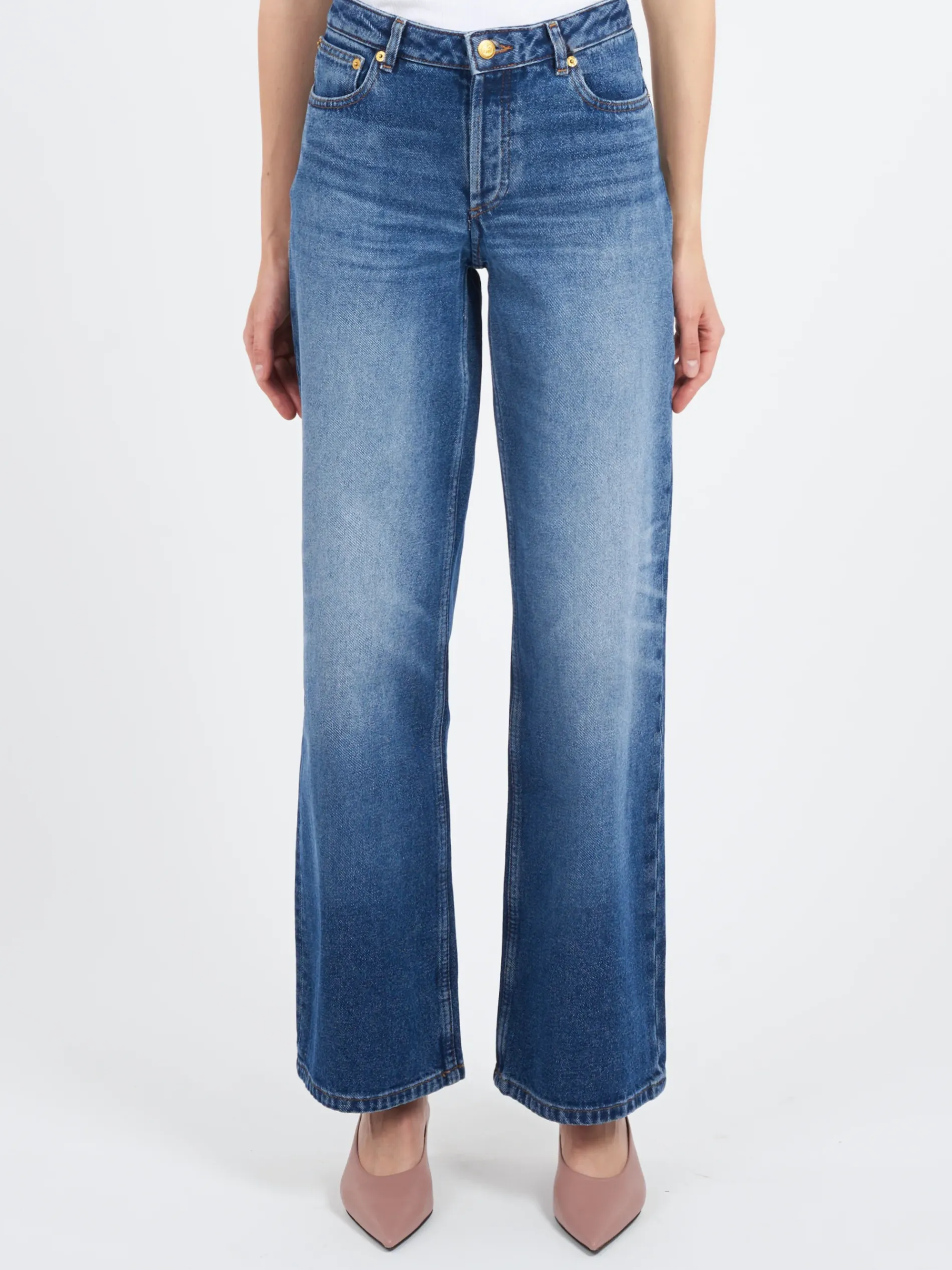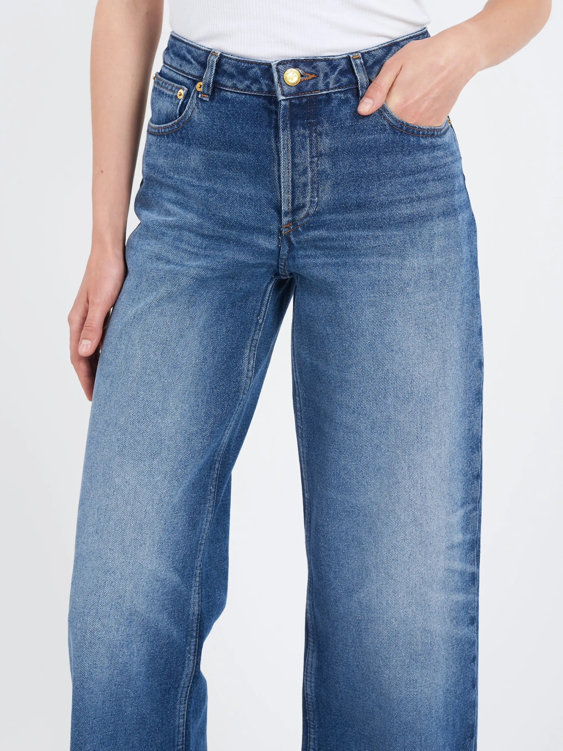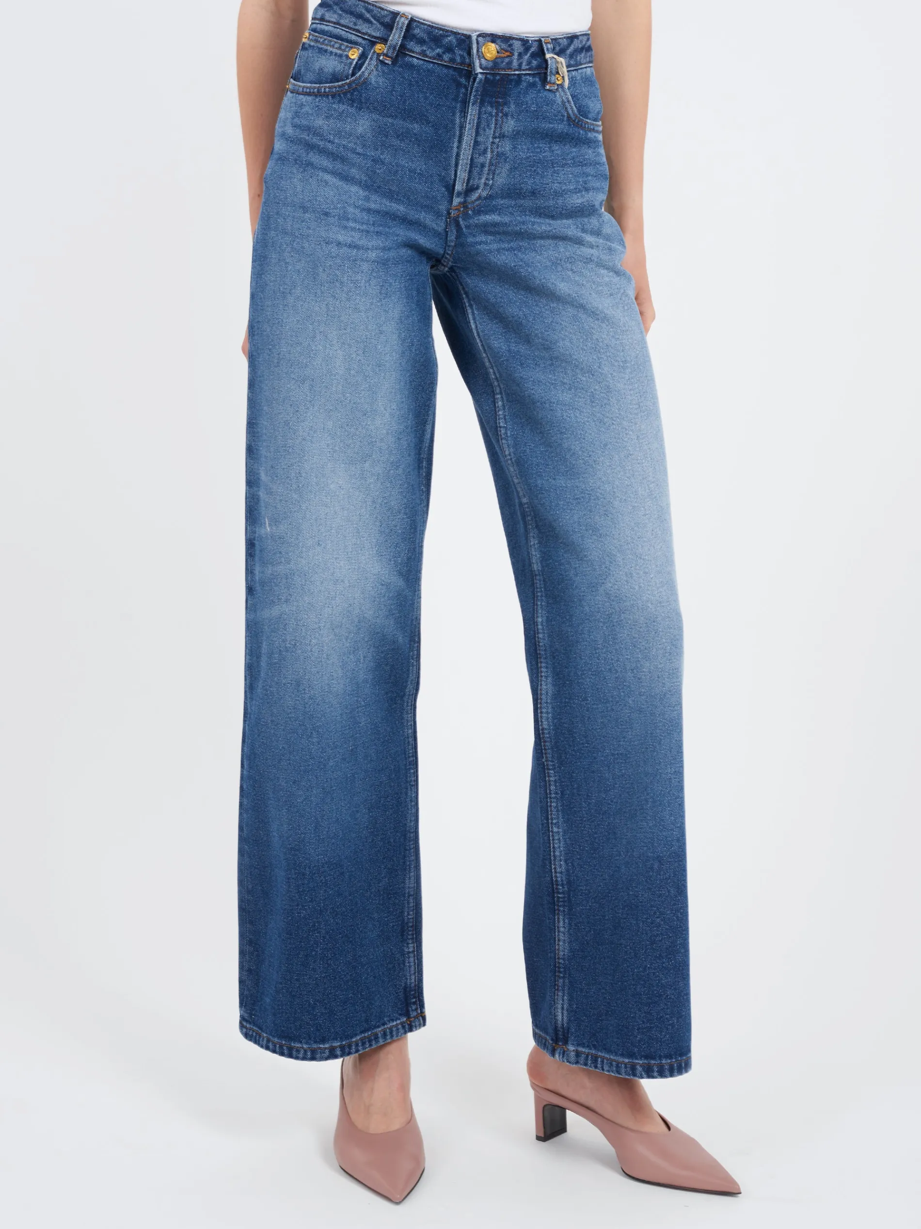 Stonewashed indigo wide leg jeans in 70’s organic denim.