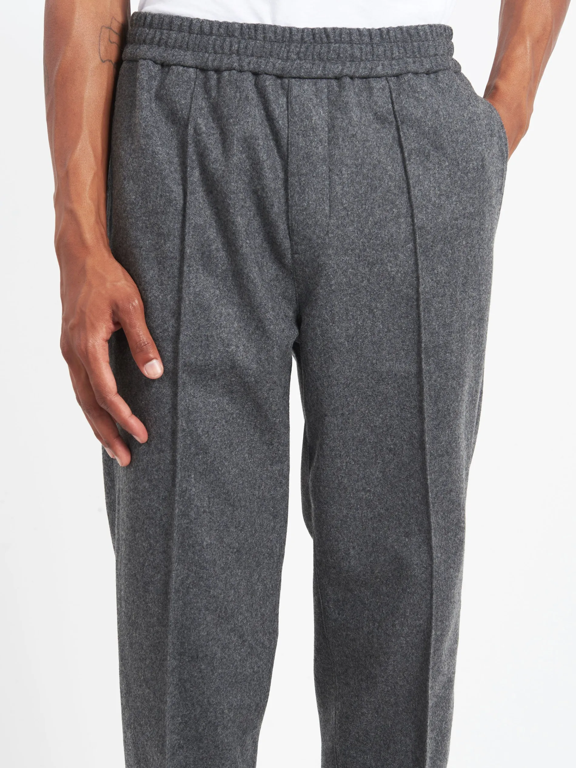 Heather navy blue pants made from a wool blend with a soft, easy drape. Neatly tailored with a straight leg.