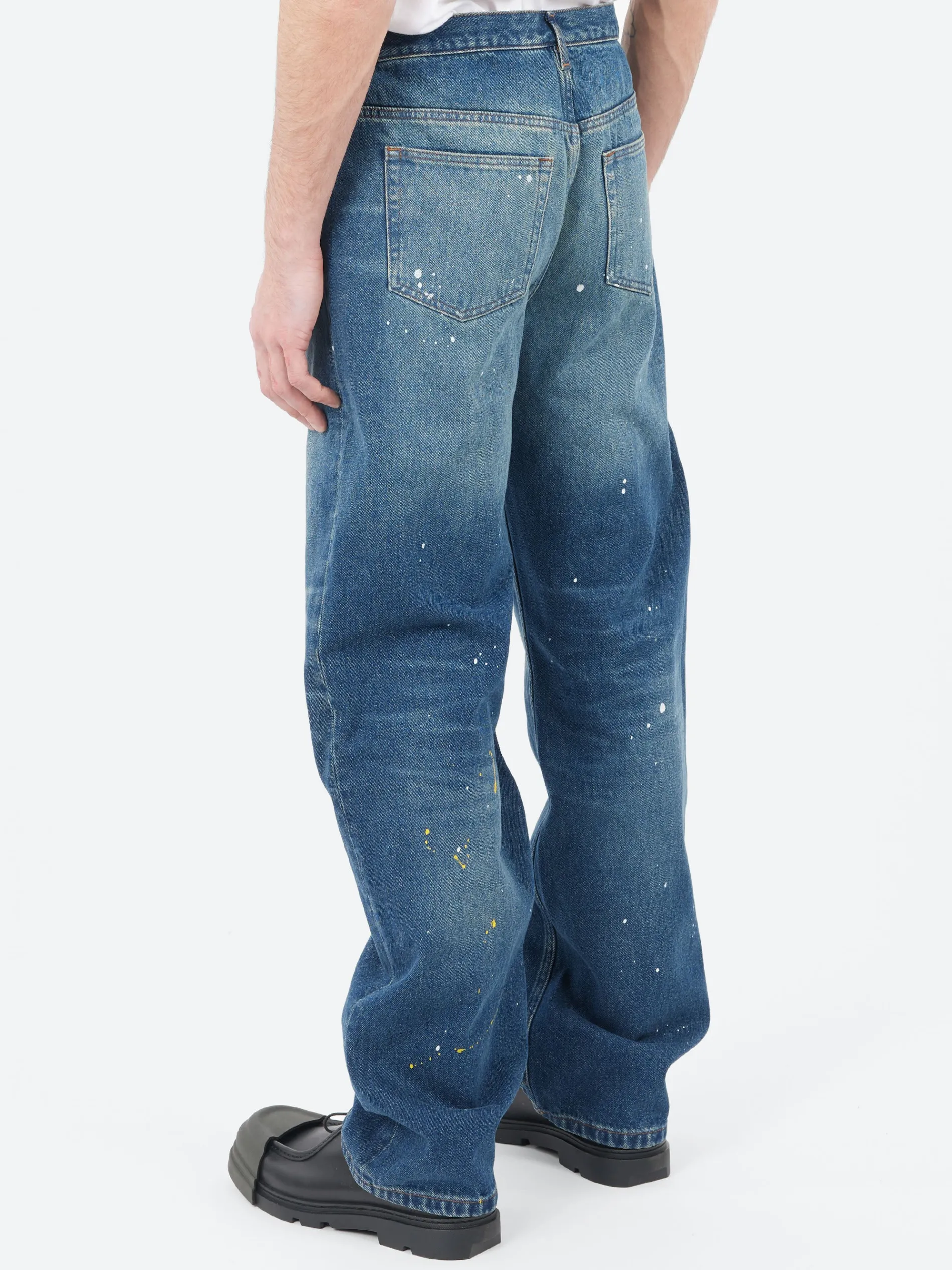 These straight, wide-leg jeans are made from washed indigo denim with unique paint splatter details for an edgy touch. Featuring a mid-rise fit, button closure with a zip fly, and a classic five-pocket style, they offer a relaxed, loose cut for ultimate comfort and laid-back style.
