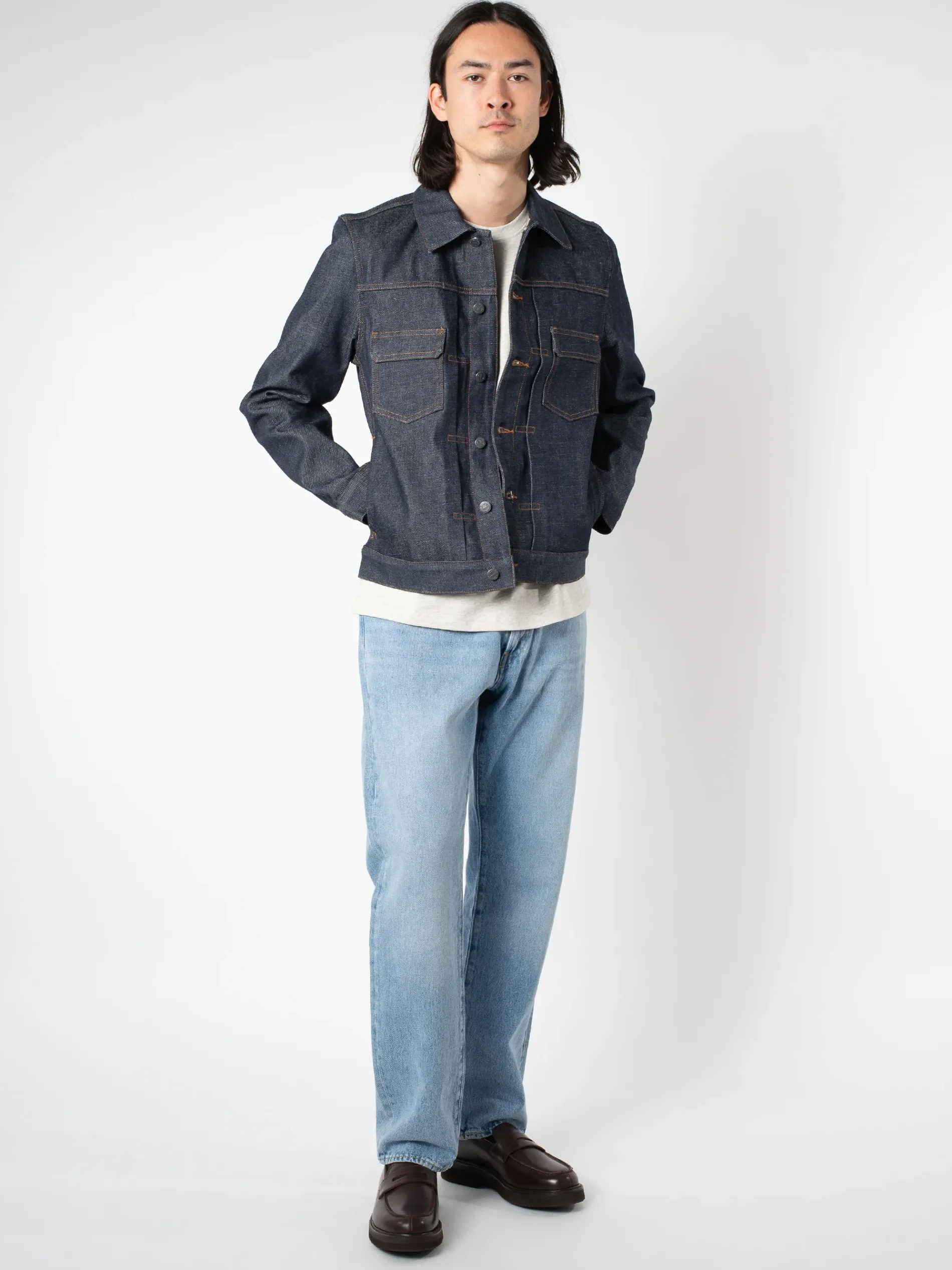 Cut in a classic silhouette, the A.P.C. work jean jacket is made from unwashed Japanese denim.
