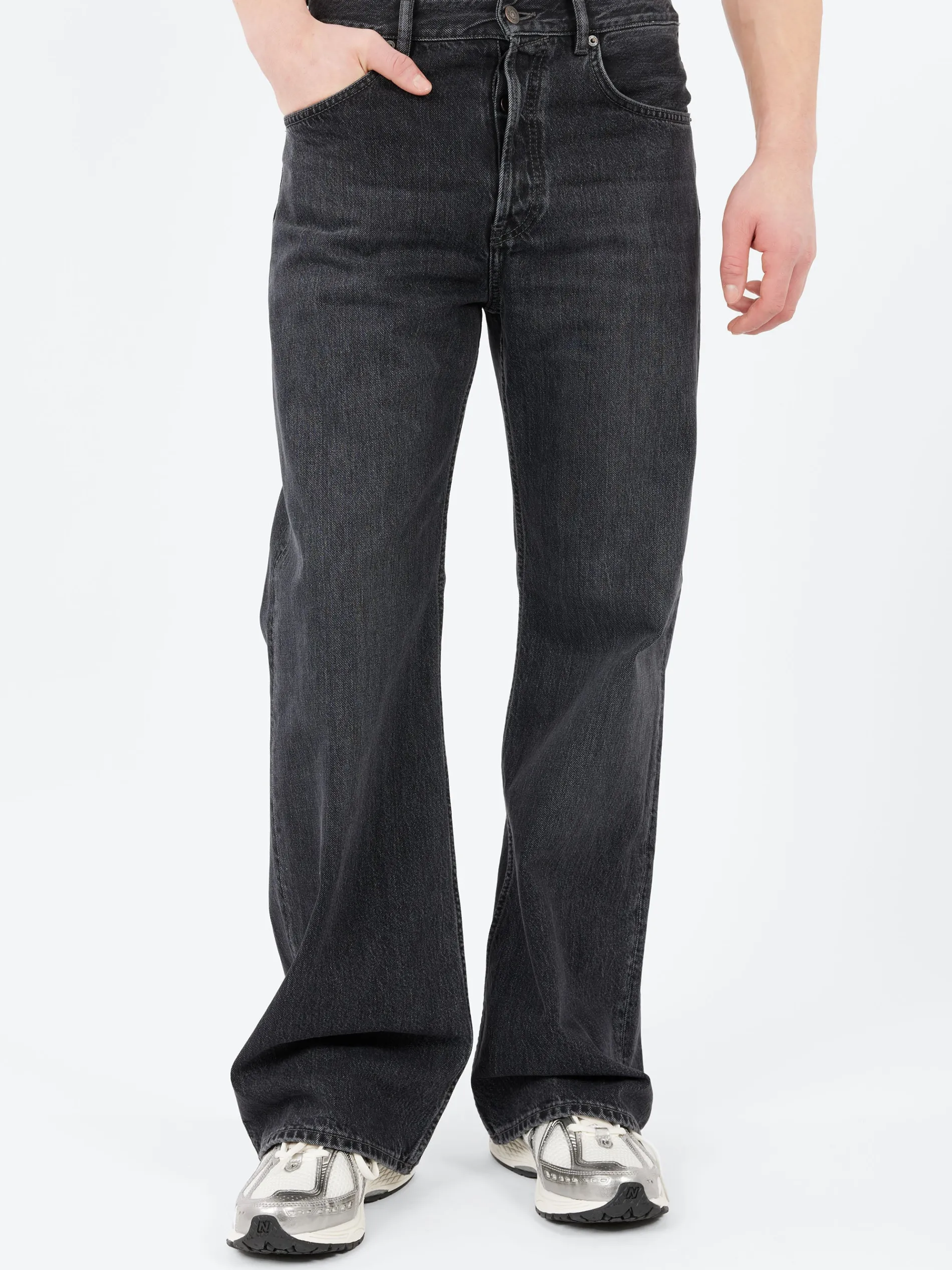 2021 jeans are cut to a loose fit with mid-waist, wide leg and long length. Made from rigid denim in deep black overdye with a washed finish.