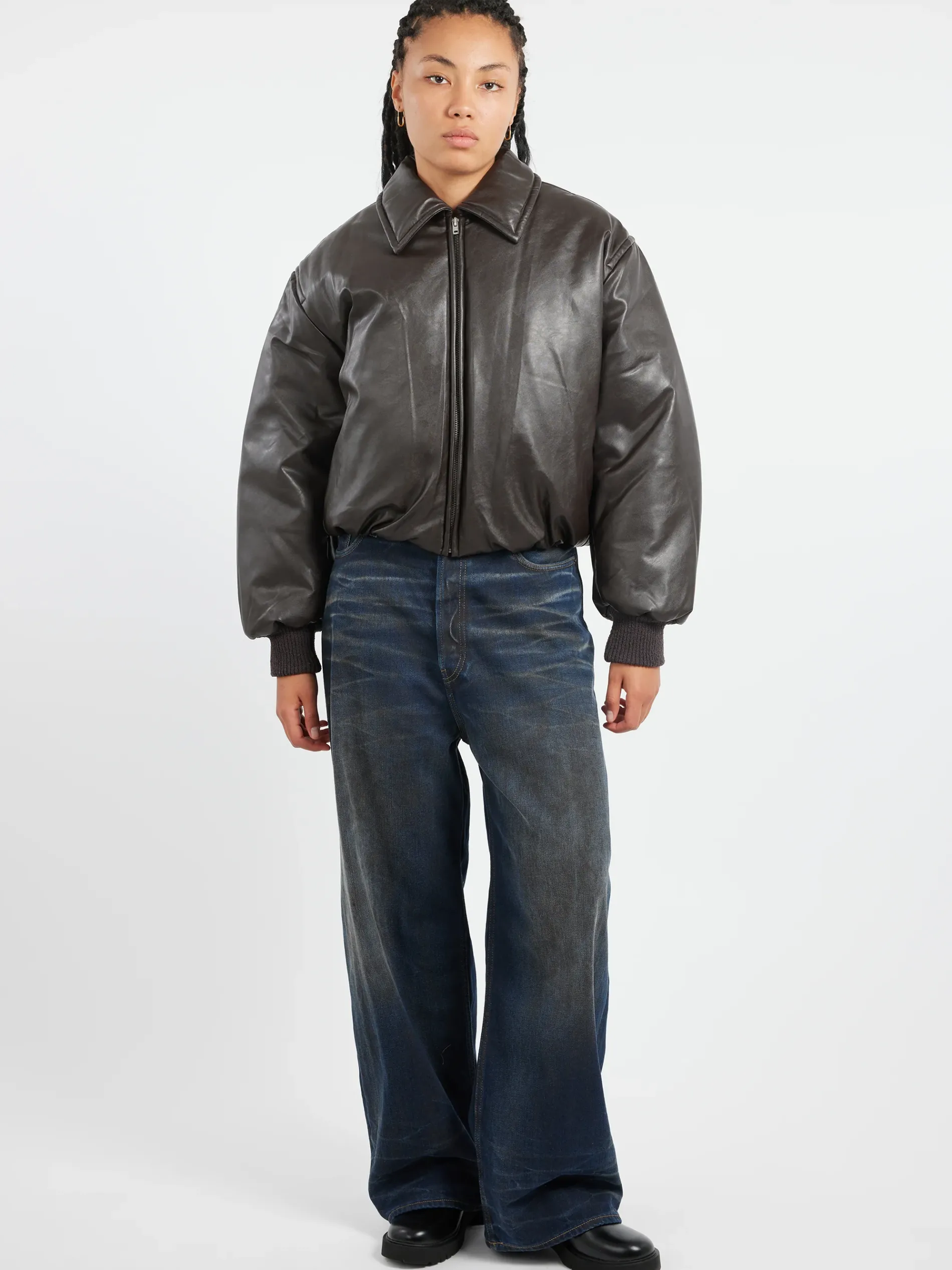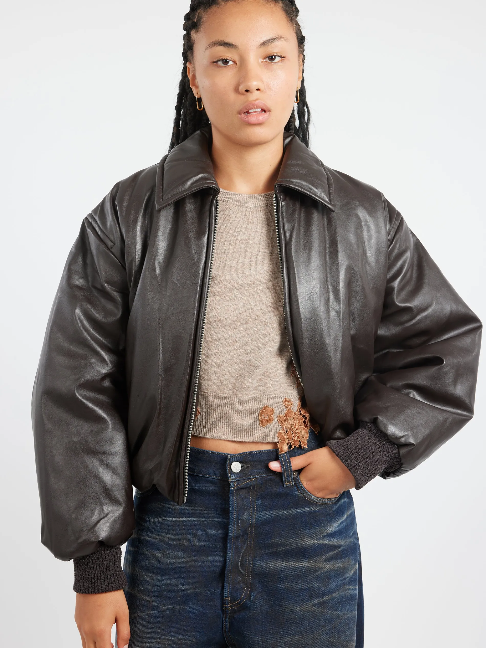 Bomber jacket features a coated leather finish, complete with a zippered closure, side pockets, and Acne Studios logo patch on the back. Cut to a relaxed fit with dropped shoulders and hip length.