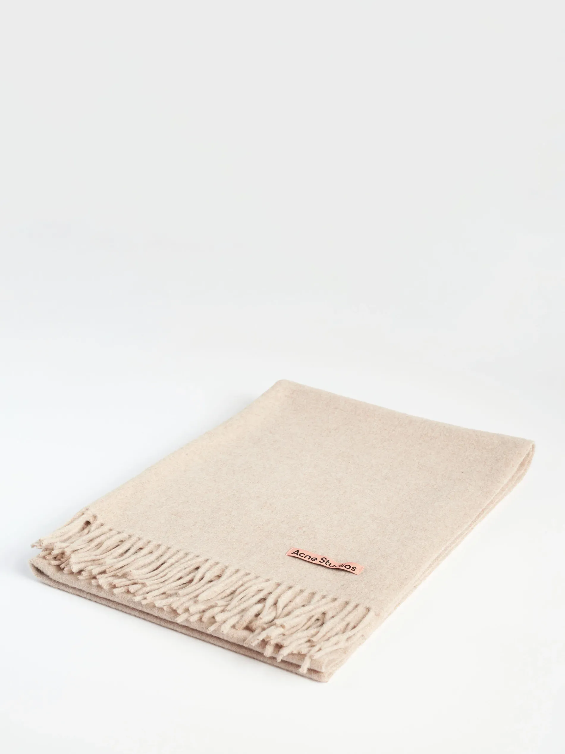 Acne Studios Canada New scarf is crafted to a wide dimension from pure wool and has fringed ends and a logo label stitched diagonally at the corner.