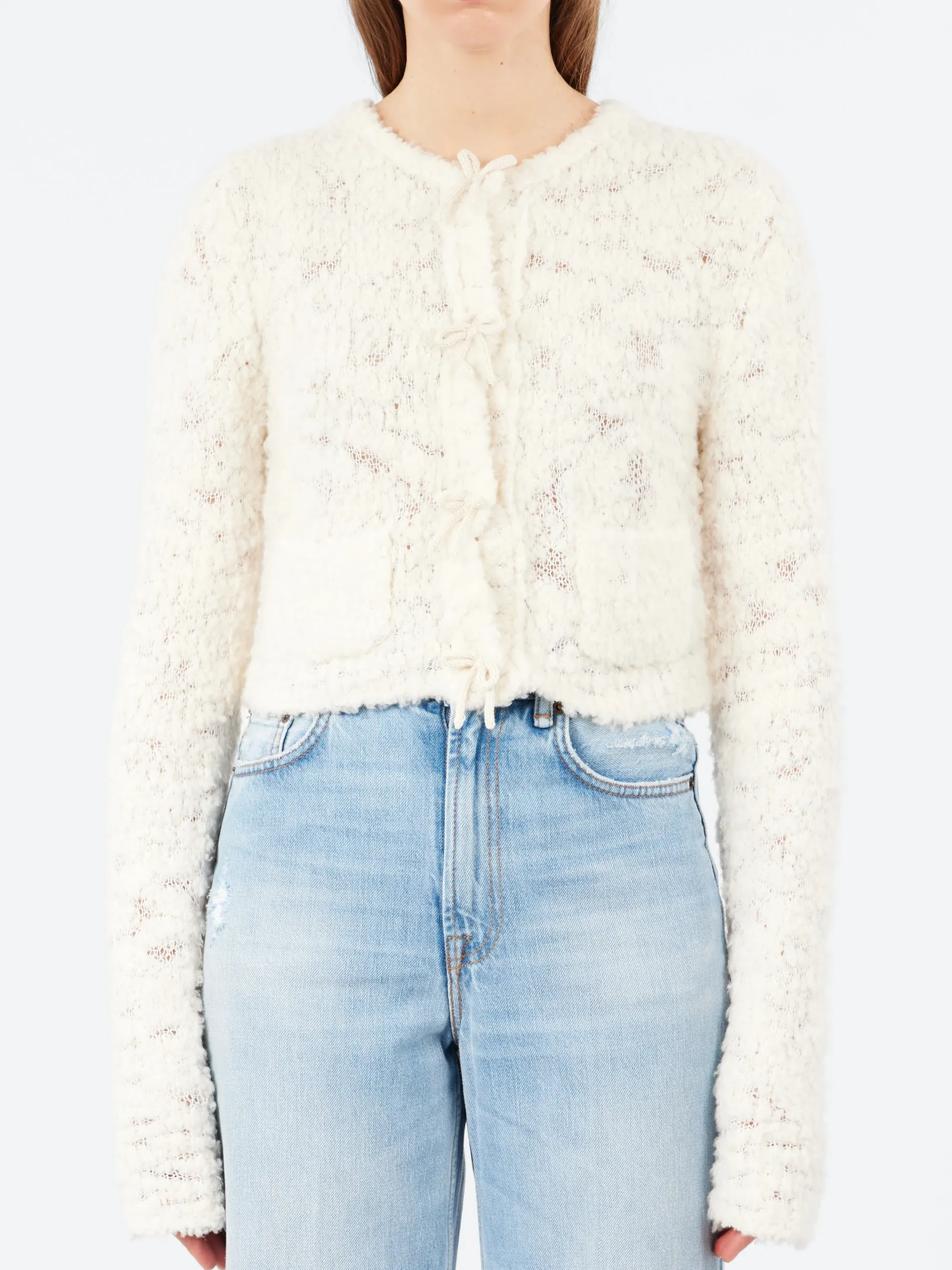The Acne Studios Bow Wool Cardigan in white is a refined piece that merges Scandinavian minimalism with feminine detailing. Crafted from a soft wool-blend fabric, this cropped cardigan features a delicate bow closure at the front, adding a touch of elegance to its clean silhouette. Its open-knit texture and slightly stretchy material offer both comfort and style, making it a versatile addition to any wardrobe.