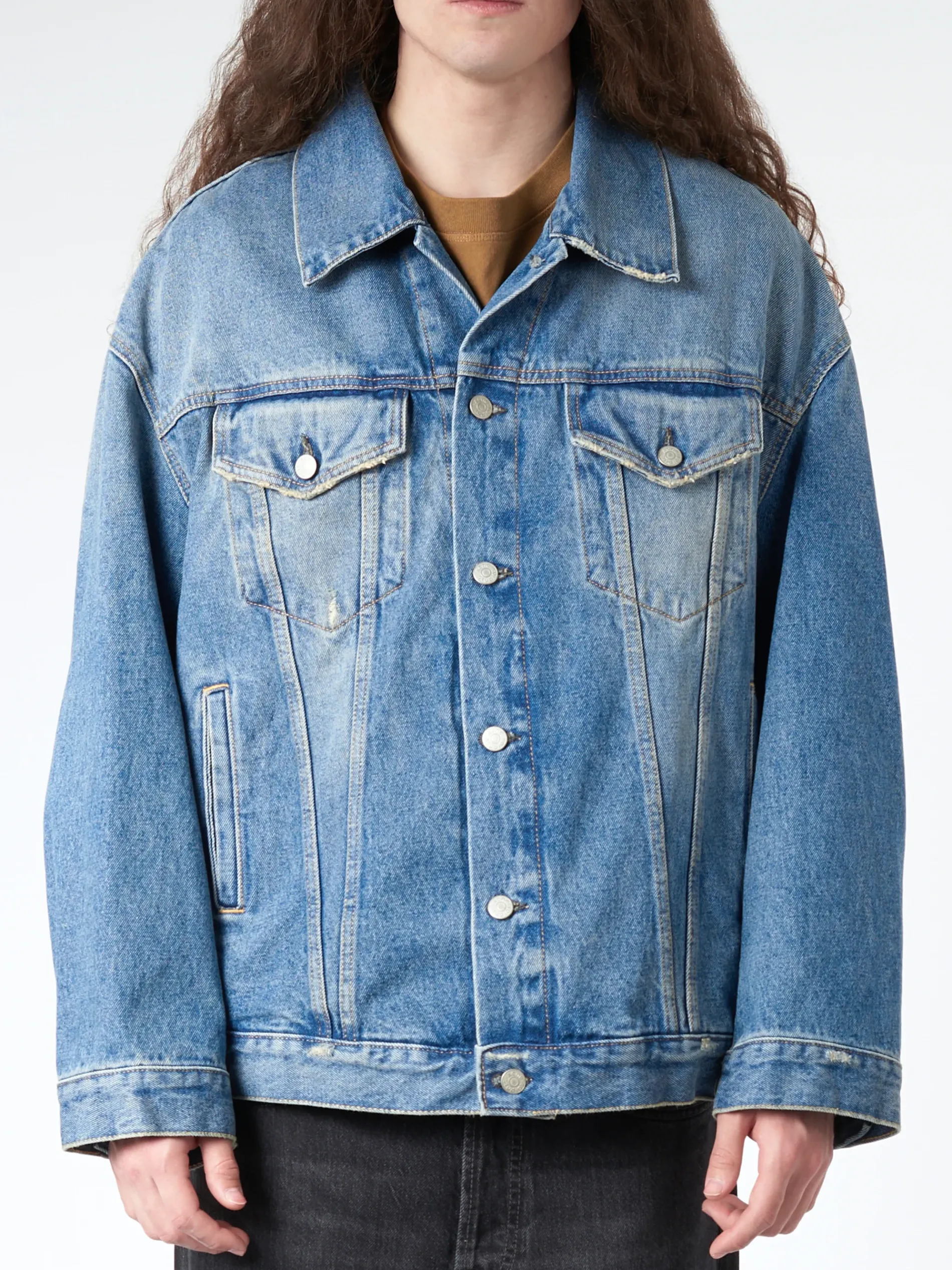 Constructed from durable denim, this oversized jacket brings a bold element to any ensemble. Its design encapsulates the brand’s core belief of crafting garments that seamlessly combine style and practicality.
