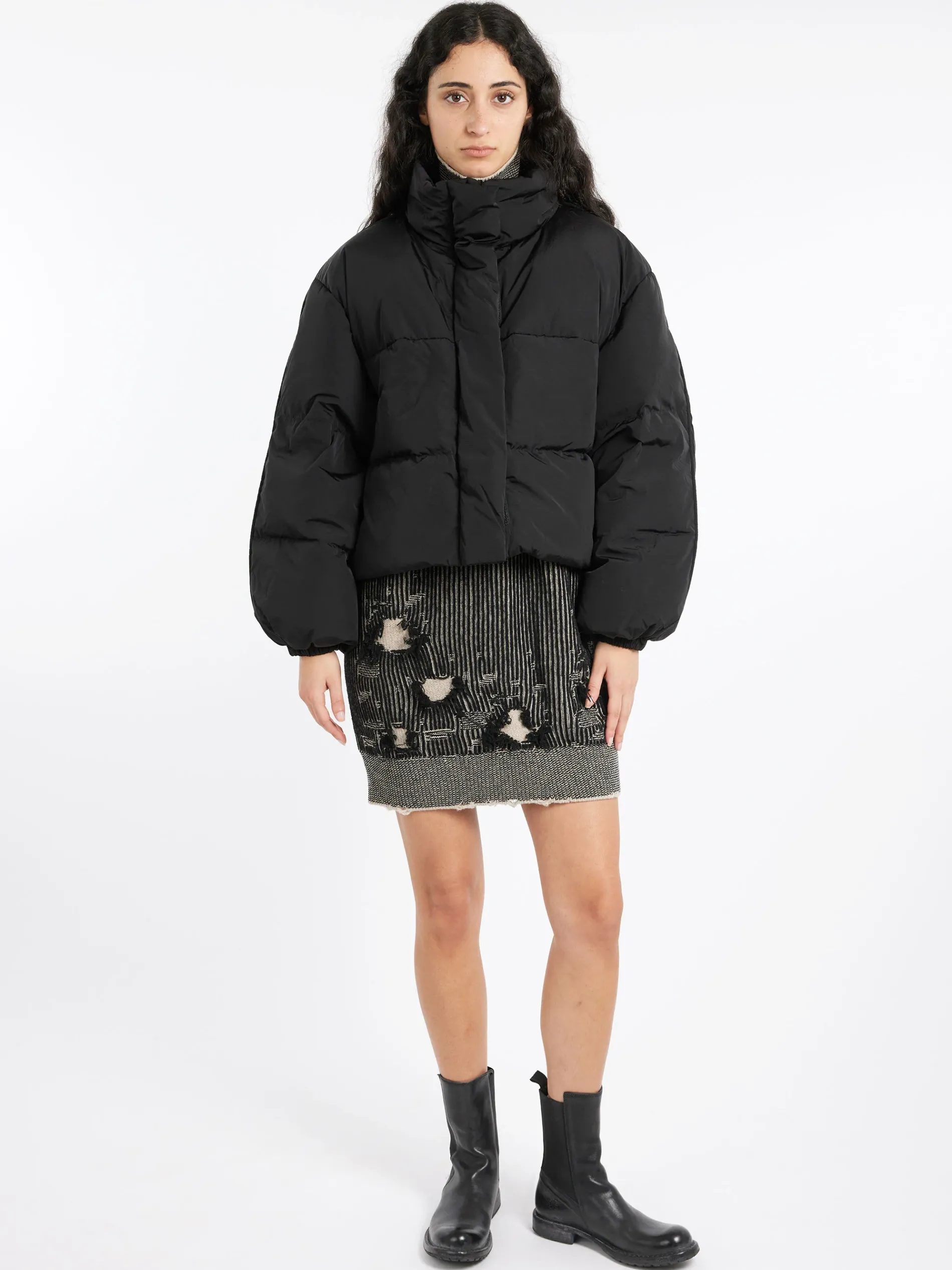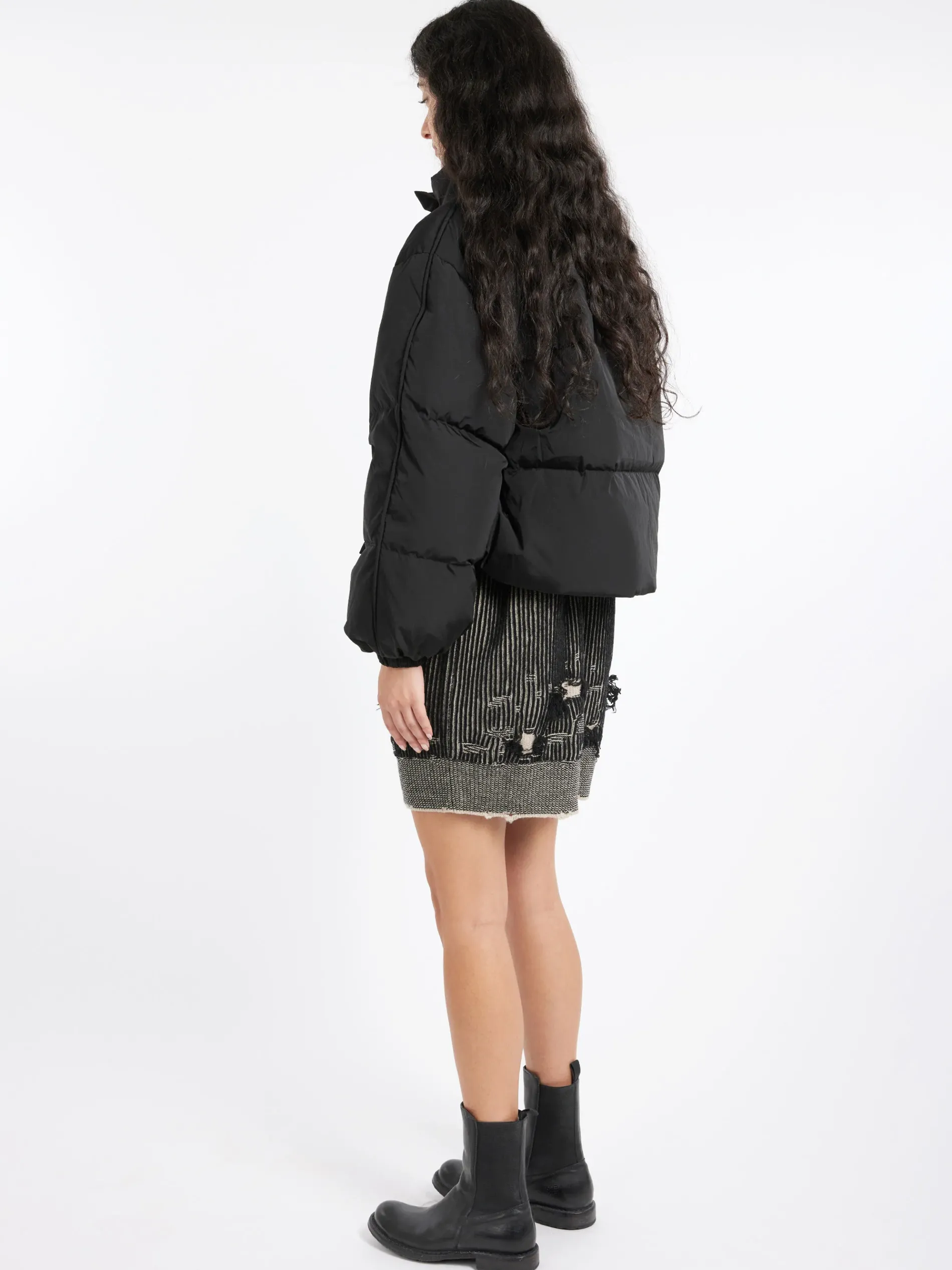 Puffer down jacket features a sprayed finish treatment and a branded logo patch at the back neckline. Cut to a relaxed fit with slightly dropped shoulders and hip length.
